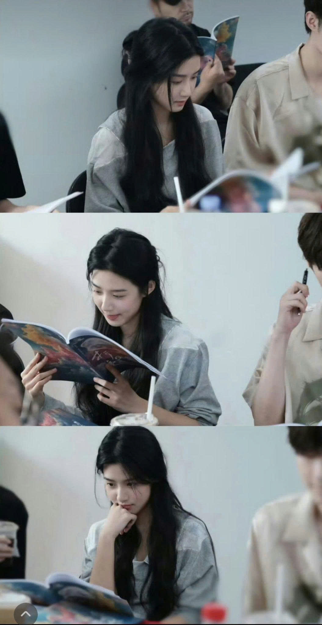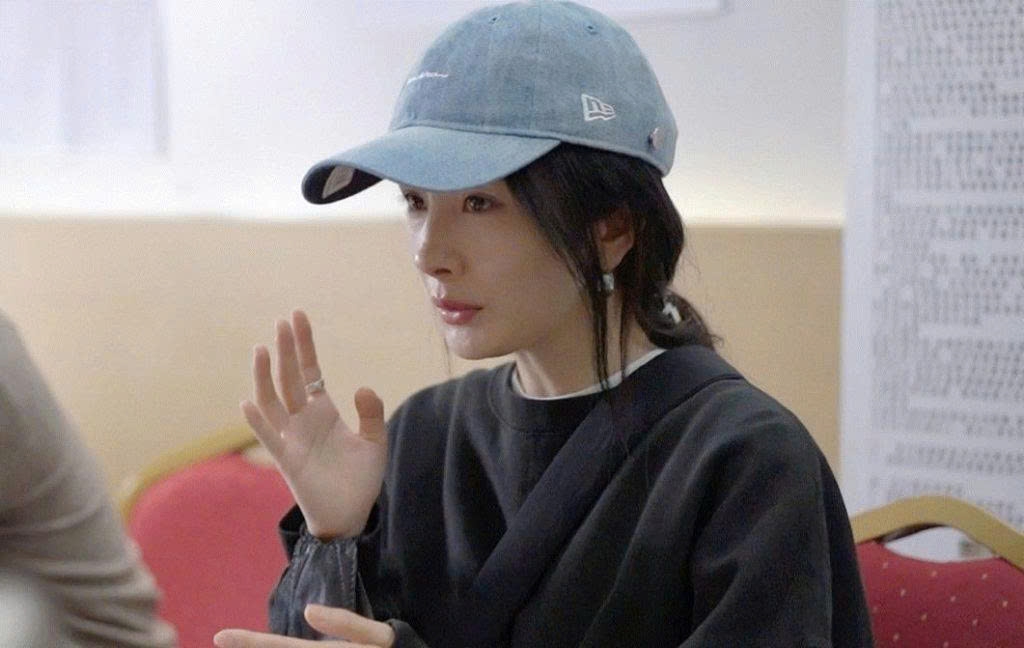 Trong các buổi đọc kịch bản, Triệu Kim Mạch thường xuất hiện với phong cách rất giản dị. Không cần lớp trang điểm cầu kỳ, cô vẫn nổi bật nhờ làn da sáng và các đường nét mềm mại.