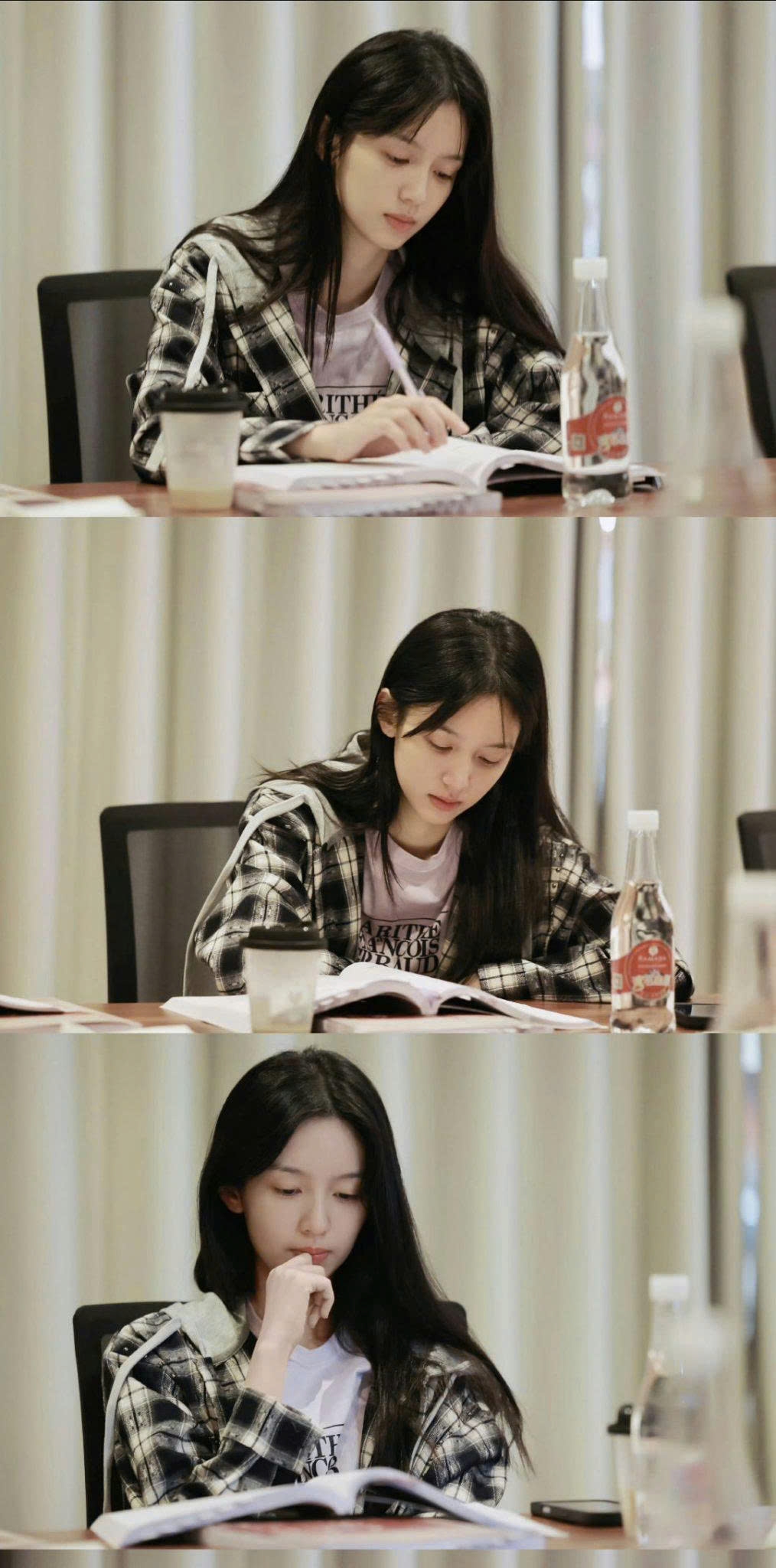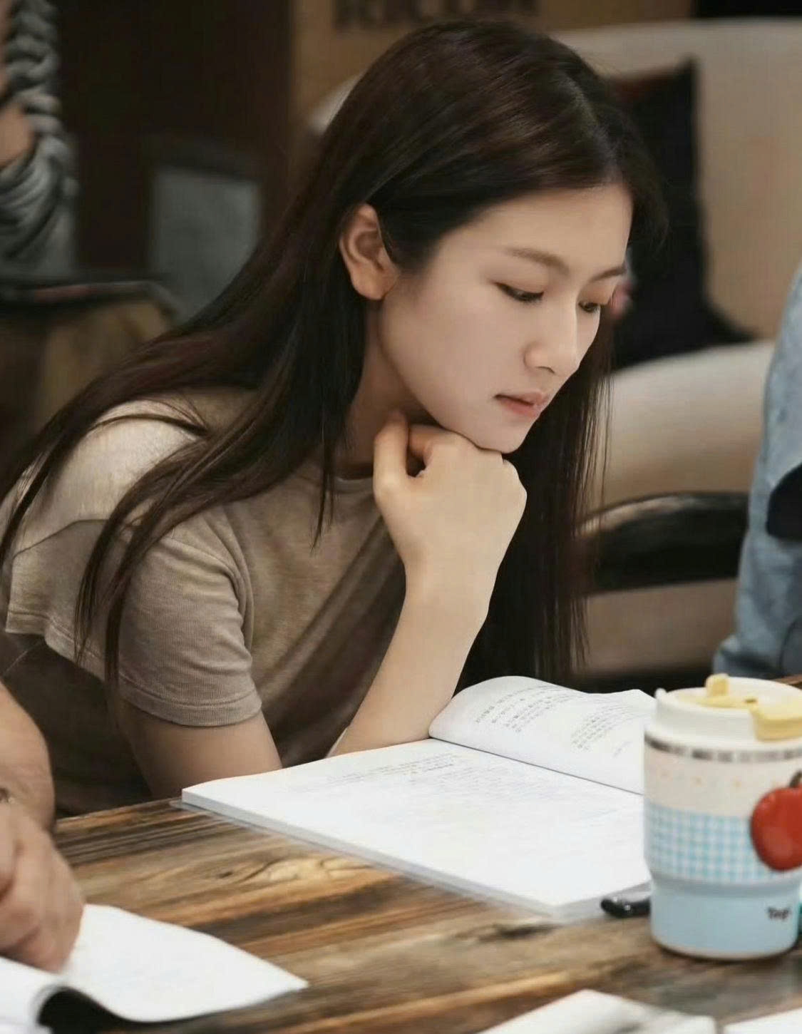 Hình ảnh này mang lại cảm giác gần gũi, giống như “cô gái nhà bên”. Khi tập trung đọc kịch bản, ánh mắt chăm chú của nữ diễn viên thể hiện sự điềm tĩnh và chiều sâu cảm xúc, cho thấy sự nhập tâm vào nhân vật.
