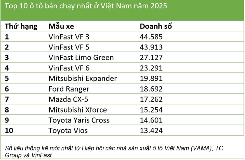 Dù vẫn giữ được vị thế trong phân khúc riêng, các mẫu xe biểu tượng như Mitsubishi Xpander và Ford Ranger đã không còn đủ sức duy trì ngôi vương trên toàn thị trường trước sức ép từ xe điện. Tuy nhiên, hai mẫu xe này vẫn góp mặt trong danh sách 10 xe bán chạy nhất năm 2025, cho thấy sức hút nhất định của dòng xe đa dụng và bán tải.