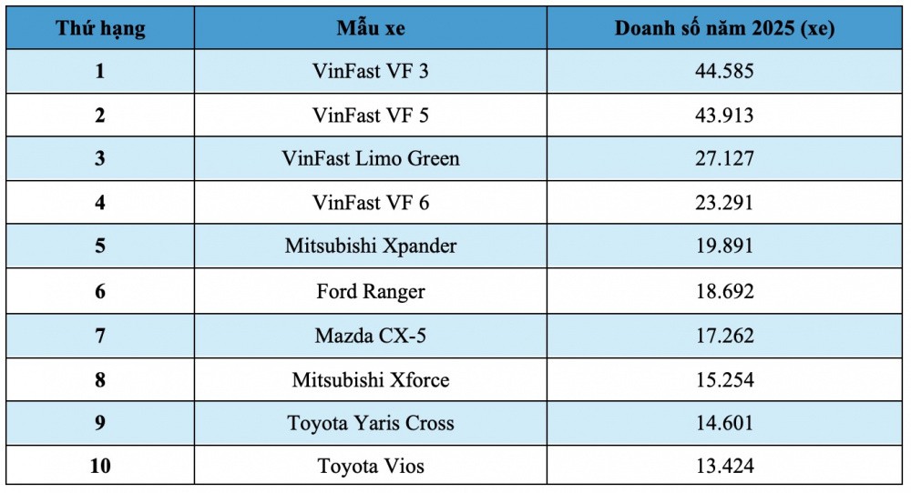 Top 10 ô tô bán chạy nhất Việt Nam năm 2025