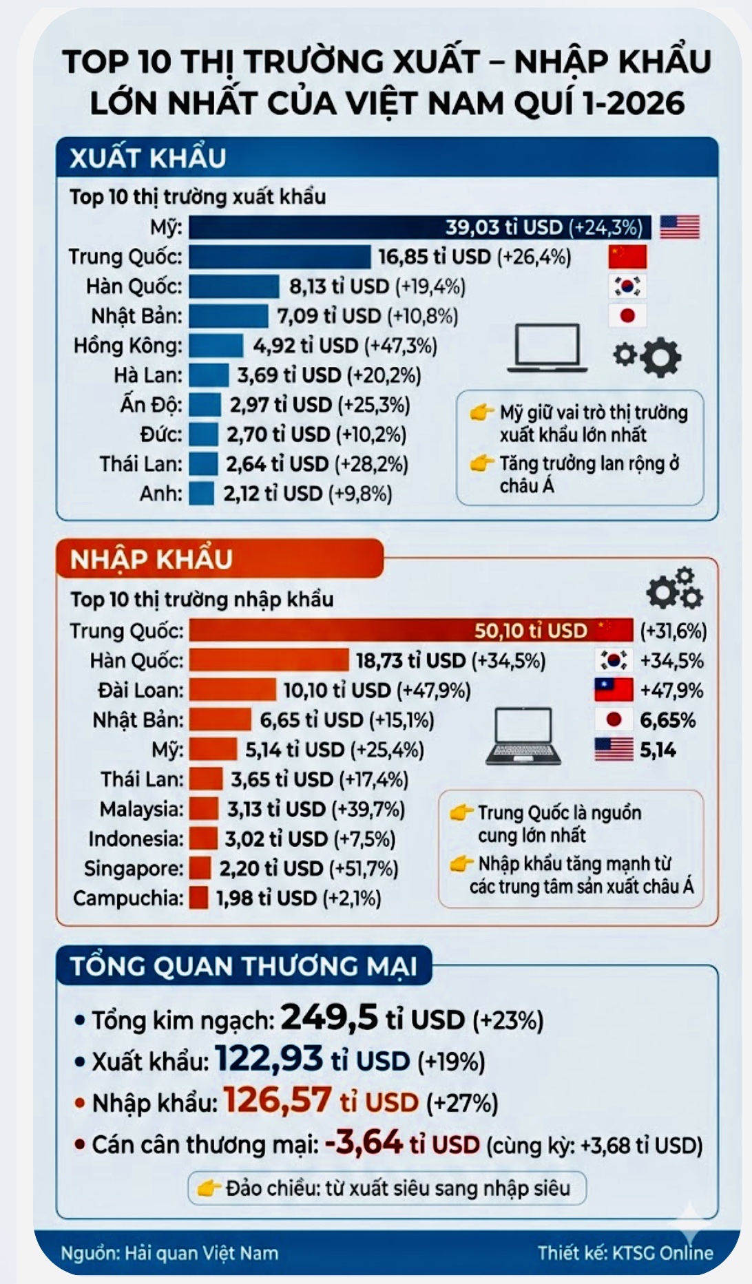 Infographic dưới đây thể hiện top 10 thị trường xuất - nhập khẩu lớn nhất của Việt Nam trong quí 1-2026.