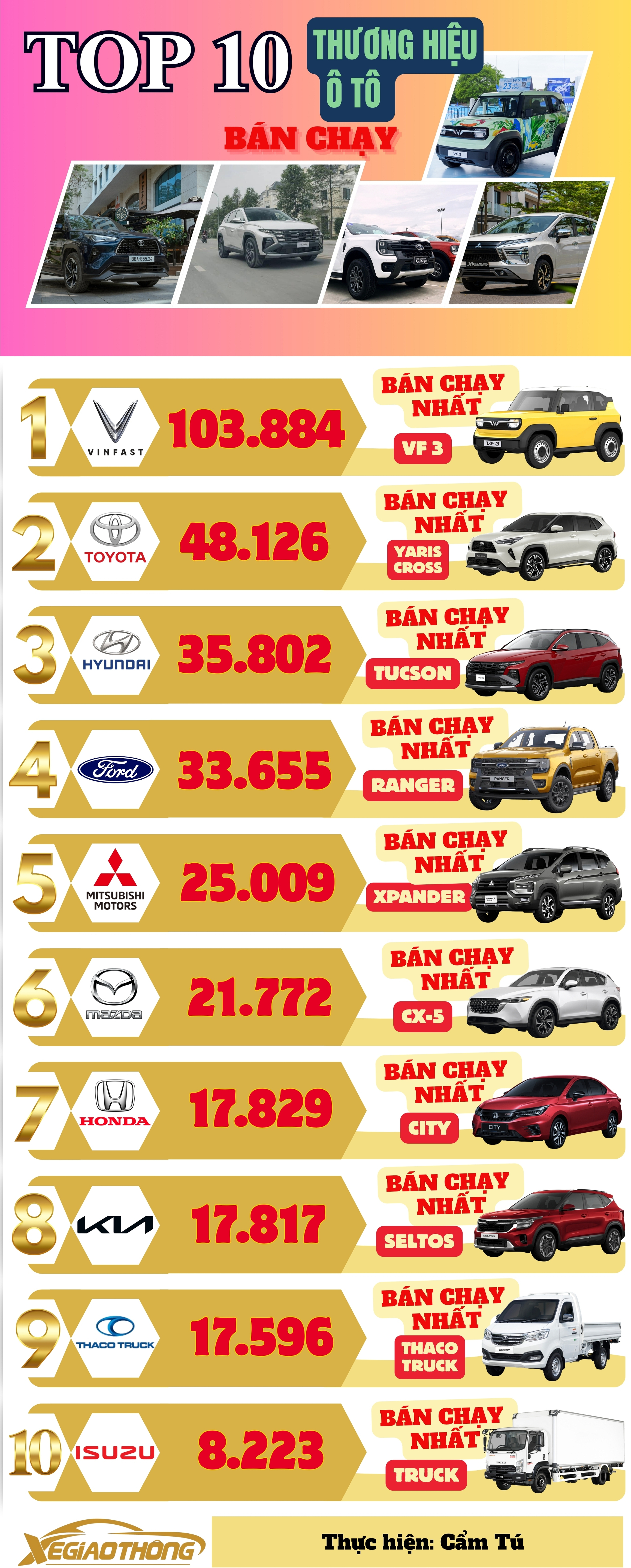 TOP 10 thương hiệu ô tô bán chạy nhất từ đầu năm