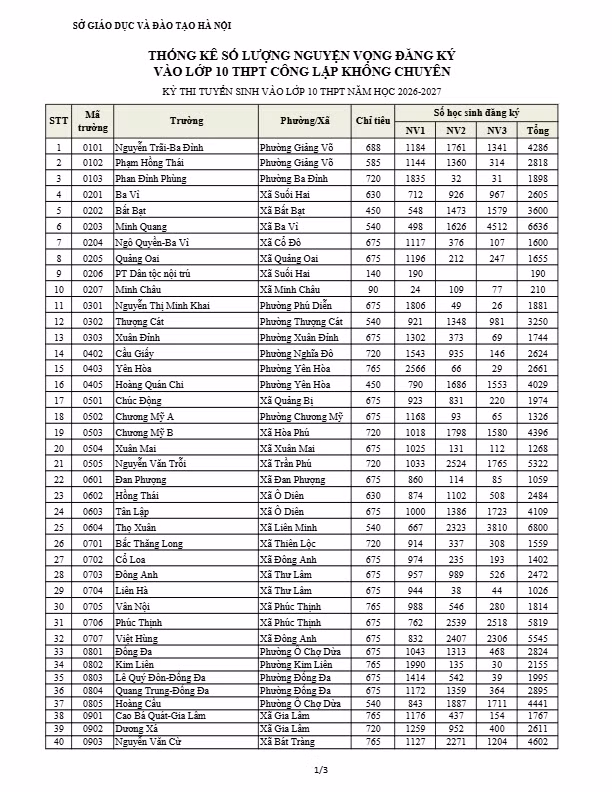 Sở GD&ĐT Hà Nội vừa công bố số lượng thí sinh đăng ký dự tuyển vào lớp 10 của các trường THPT công lập không chuyên và chuyên năm học 2026-2027.