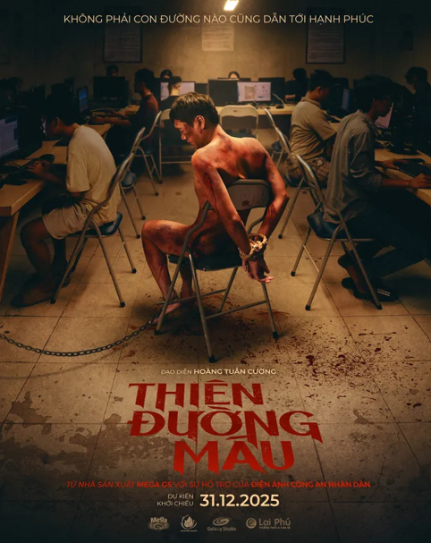 Poster nổi bật với hình ảnh nhân vật bị trói trong căn phòng tối – ẩn dụ trực diện cho các đường dây lừa đảo lao động xuyên quốc gia trong Thiên Đường Máu
