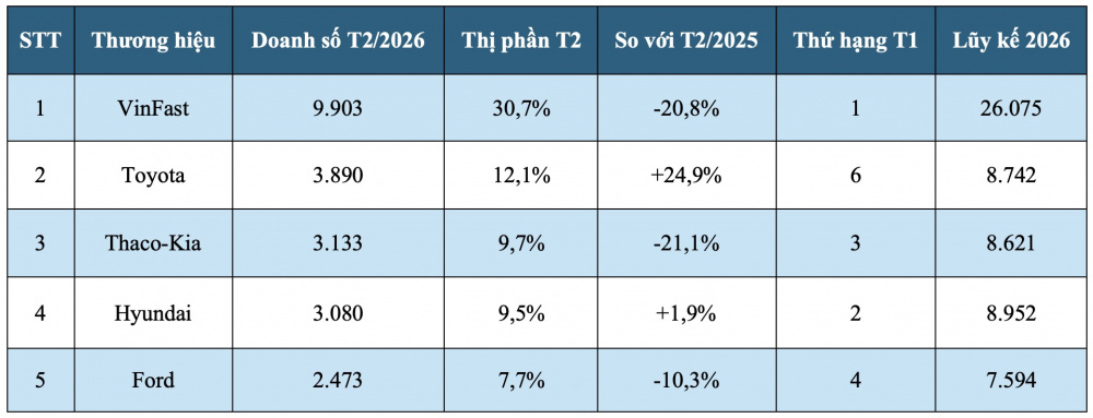 Trong tháng 2/2026, VinFast đạt doanh số 9.903 xe, chiếm 30,7% thị phần toàn thị trường. Dù giảm 20,8% so với cùng kỳ năm trước, mức sụt giảm này không làm ảnh hưởng đáng kể đến vị thế của hãng khi khoảng cách với các đối thủ vẫn rất lớn.