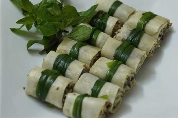 Người Yên Bái luôn biết tận dụng sản vật quanh mình để sáng tạo nên những món ăn dân dã nhưng hấp dẫn. Măng vầu cuốn thịt là món ăn tiêu biểu: măng non luộc sơ, cuốn cùng thịt băm, trứng và rau răm rồi đem hấp hoặc chiên vàng. Khi ăn, vị ngọt bùi của thịt hòa quyện vị hơi the, đắng nhẹ của măng khiến thực khách nhớ mãi. Ảnh amthuc