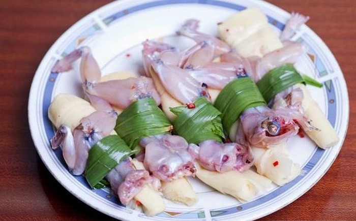 Hay ngóe ôm măng – món ăn dung dị mà đậm đà, kết hợp vị ngọt của ngóe (nhái rừng) cùng vị chua thanh của măng, tạo thành món “hao cơm” đặc trưng của miền sơn cước. Ảnh luhanhvietnam