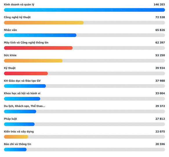 Trong danh sách 12 nhóm ngành có nhiều thí sinh chọn năm 2025 còn có các nhóm ngành: Nhân văn (9,6%), Máy tính và công nghệ thông tin (9,2%), Sức khỏe (7,8%), Kỹ thuật, Khoa học và đào tạo giáo viên (5,8%), Khoa học xã hội và hành vi (4,8%),...