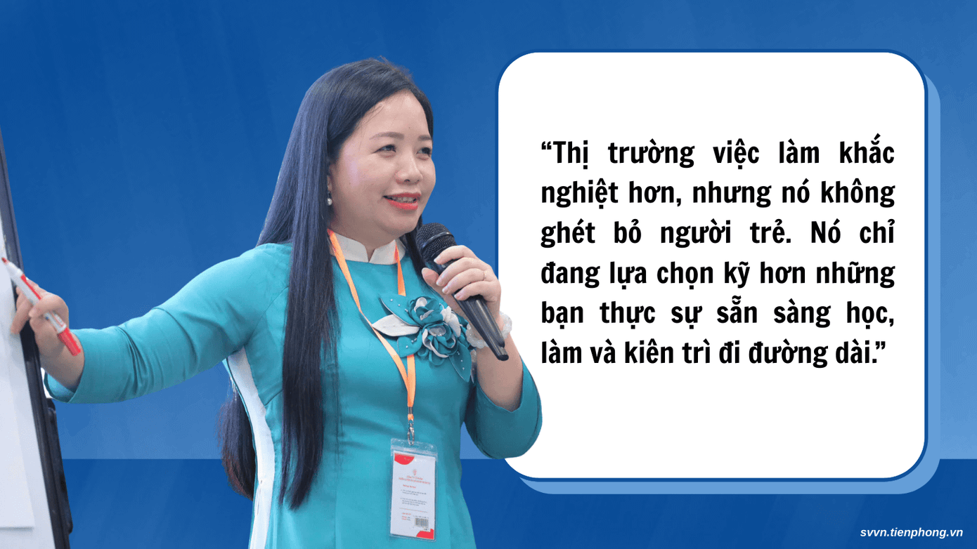 Bà Đoàn Vân Anh: Tôi muốn nói với các bạn ba điều. Một là, đừng đồng nhất giá trị bản thân với kết quả tuyển dụng. Một email từ chối không nói lên con người bạn, nó chỉ nói rằng ở thời điểm này, bạn chưa phải "đáp án đúng" của họ. Hai là, hãy thành thật soi lại mình đang thiếu gì, can đảm nhìn vào lỗ hổng kỹ năng để lên kế hoạch lấp đầy. Ba là, hãy hành động nhỏ, đều đặn thay vì chờ cơ hội lớn.