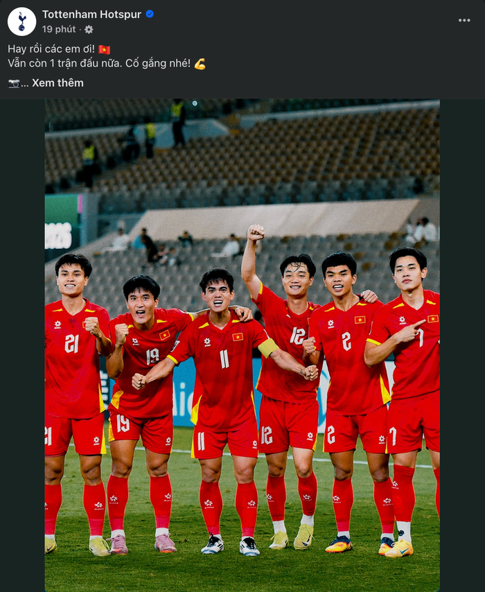 Sau trận bán kết U23 châu Á, nơi U23 Việt Nam để thua U23 Trung Quốc với tỉ số 0-3, trang chủ Tottenham Hotspur bất ngờ đăng tải dòng trạng thái bằng tiếng Việt: “Hay rồi các em ơi! Vẫn còn 1 trận đấu nữa. Cố gắng nhé!”. Bài viết nhanh chóng nhận được nhiều lượt tương tác từ cộng đồng mạng trong nước.