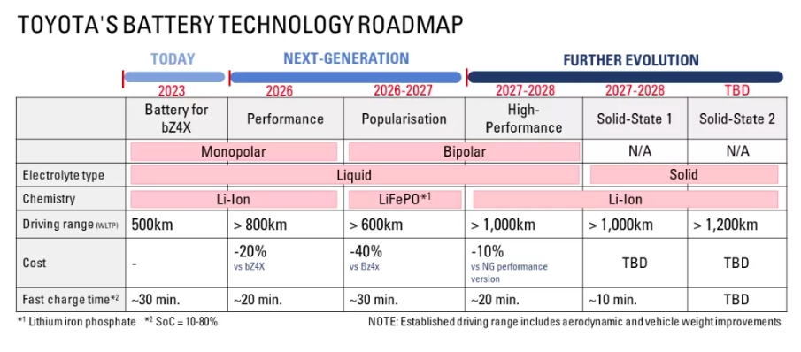 Pin thể rắn được Toyota kỳ vọng sẽ vượt trội hoàn toàn so với pin lithium-ion truyền thống, nhờ mật độ năng lượng cao, sạc nhanh, nhẹ hơn và có tuổi thọ dài hơn. Theo lộ trình phát triển mà hãng công bố, phiên bản đầu tiên của pin thể rắn có thể giúp xe điện đạt phạm vi di chuyển khoảng 1.000 km chỉ với một lần sạc, và có khả năng sạc từ 10% lên 80% trong chưa đầy 10 phút.
