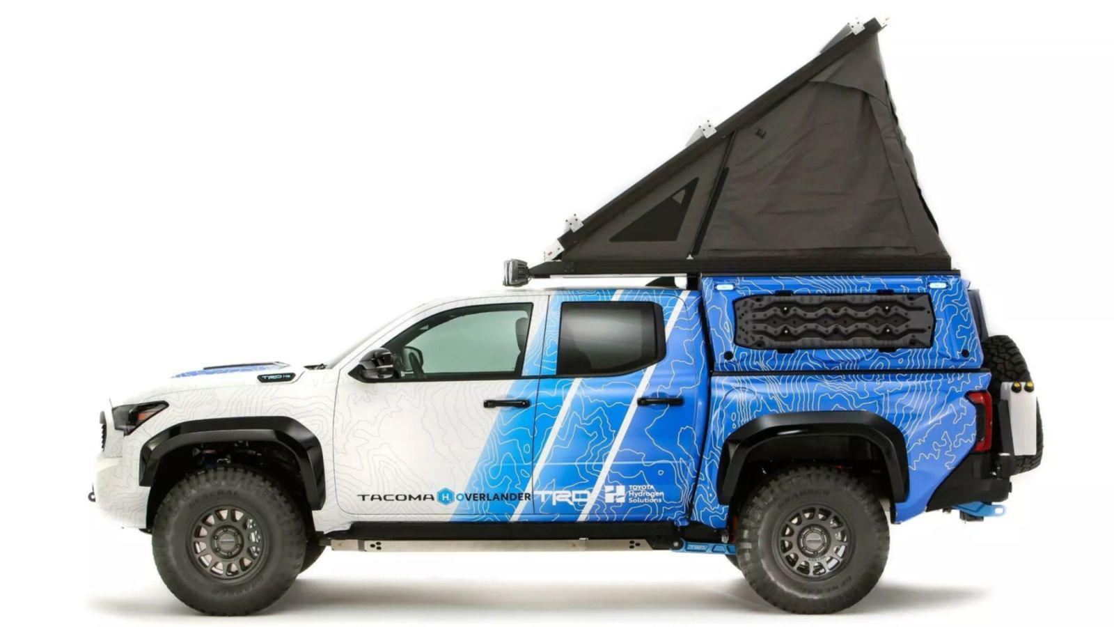 Tính năng vận hành dã ngoại (Overlanding) được mở rộng đến phần đuôi xe. Nơi đây trang bị một lều trên nóc có thể bật lên và một mái che phía sau có khả năng mở ra từ cả ba phía. Cửa thùng sau cũng treo một bánh xe dự phòng cỡ lớn, hoàn thiện dáng vẻ của một chiếc xe thám hiểm. Tacoma H2 Overlander là một trong hơn 10 mẫu xe Toyota sẽ xuất hiện tại SEMA 2025 ở Las Vegas, diễn ra vào tháng 11.