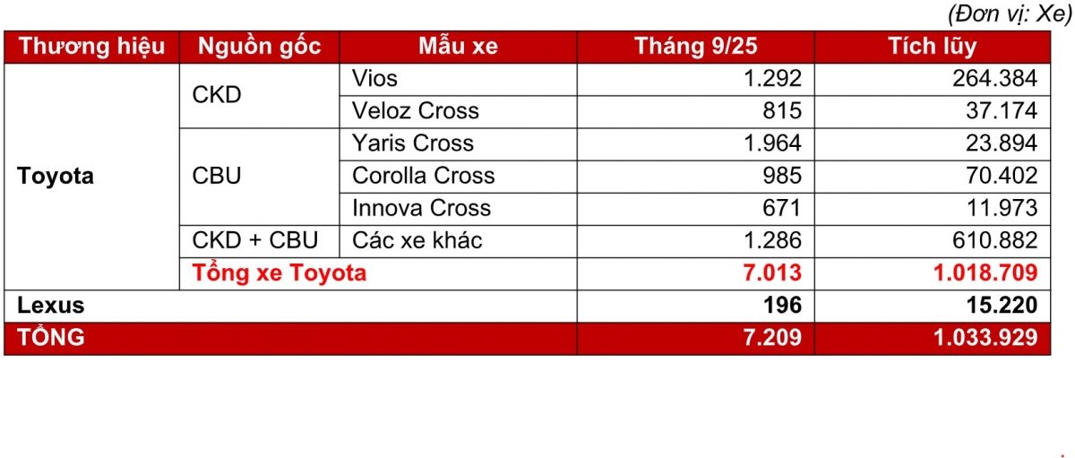 Trong tháng 9 vừa qua, Toyota Việt Nam (TMV) đã bán được tổng cộng 7.209 xe ra thị trường, trong đó có 7.013 xe thuộc thương hiệu Toyota, tăng trưởng 36% so với tháng trước. Trong đó, xe lắp ráp trong nước bán được 2.338 xe và xe nhập khẩu nguyên chiếc đạt doanh số 4.675 xe.