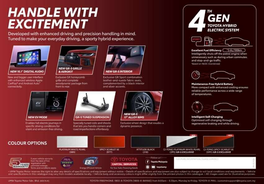 Về màu sắc, phiên bản 1.5 HEV tiêu chuẩn được cung cấp cho các tùy chọn Platinum White Pearl, Spicy Scarlet SE, Attitude Black, Silver metallic và Celestite Grey metallic độc quyền cho phiên bản hybrid, trong khi bản GR Sport có Platinum White Pearl, Spicy Scarlet SE và Attitude Black với hai màu đầu tiên có thêm tùy chọn hai màu kết hợp phù hợp.