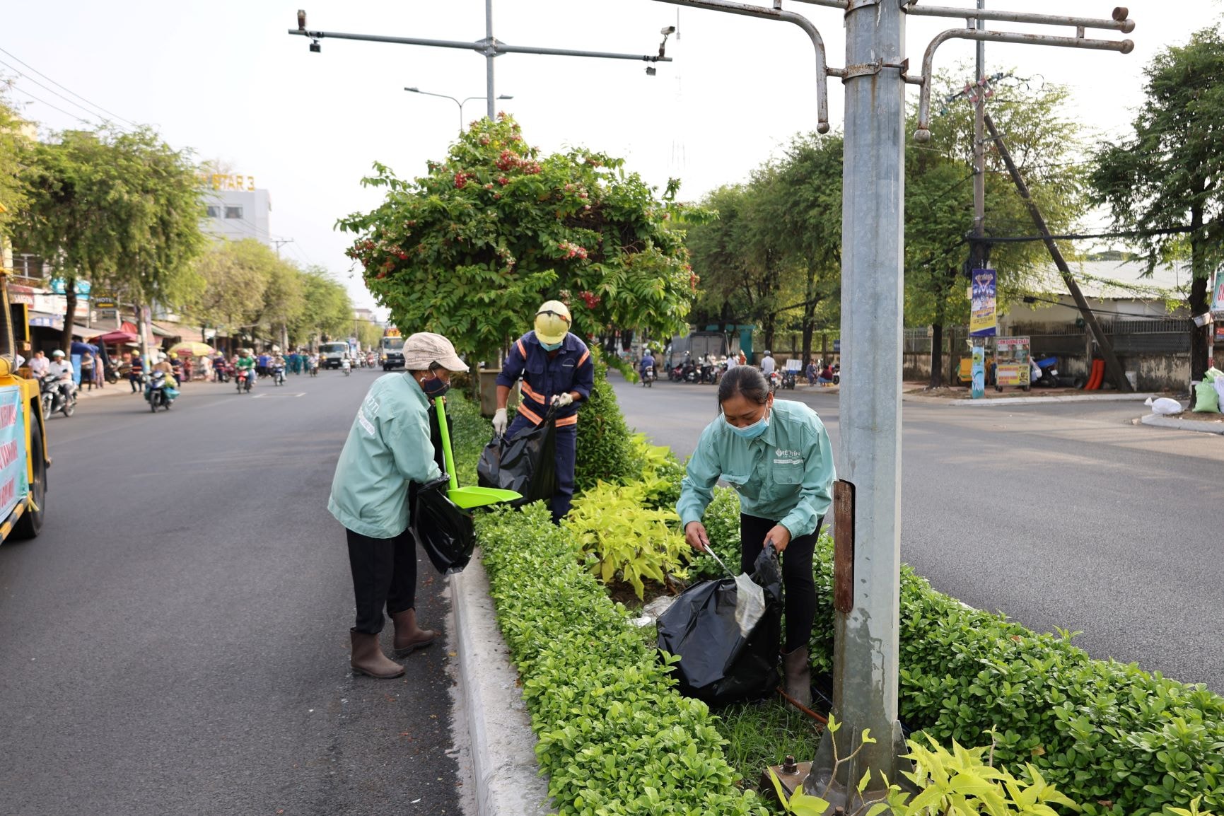 Công nhân vệ sinh cùng ra quân nhặt rác trên đường 30 tháng 4