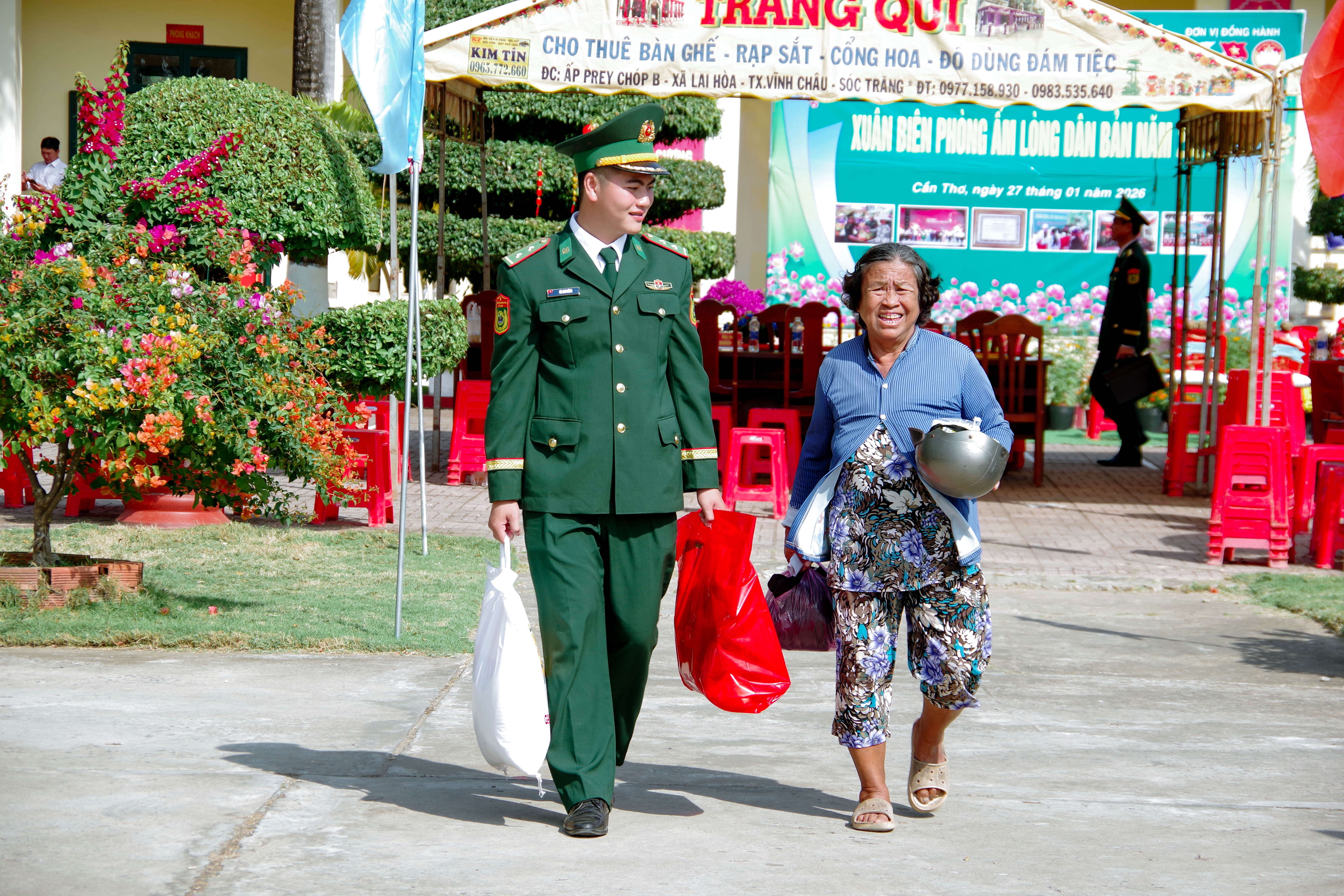 Cán bộ đồn Biên phòng Lai Hòa hỗ trợ người dân mang quà ra xe. (Ảnh: Văn Long)