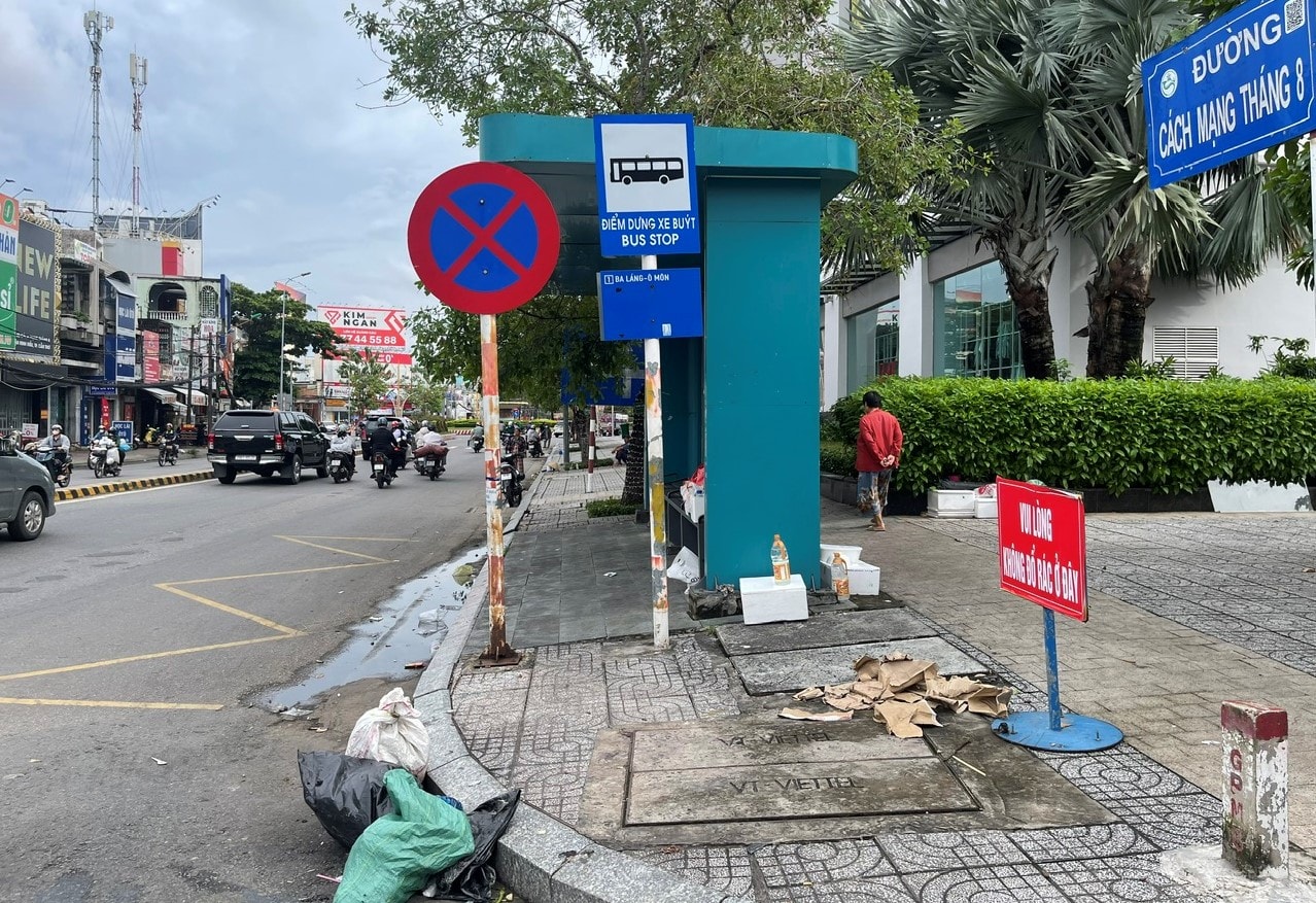 Mặc dù địa phương có đặt biển cấm đỗ rác, thế nhưng một số hộ dân vẫn thản nhiên tập kết rác tại nhà chờ xe buýt này (đường Cách Mạng tháng 8)