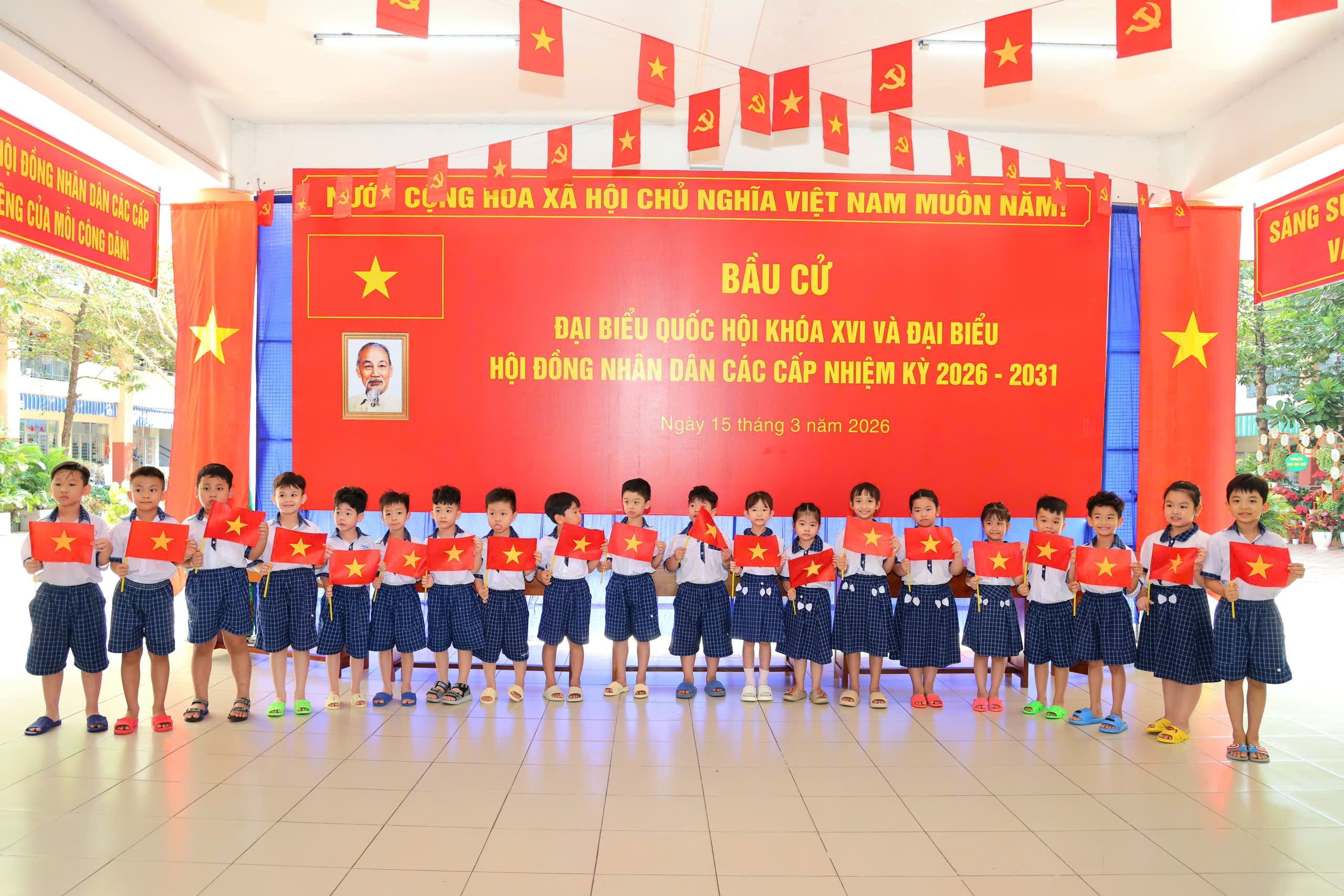 Không khí ấy cũng lan tỏa đến từng mái trường, từ mầm non đến trung học, các em học sinh cũng rộn ràng cờ hoa, háo hức tìm hiểu về ý nghĩa của ngày bầu cử - ngày hội của toàn dân.