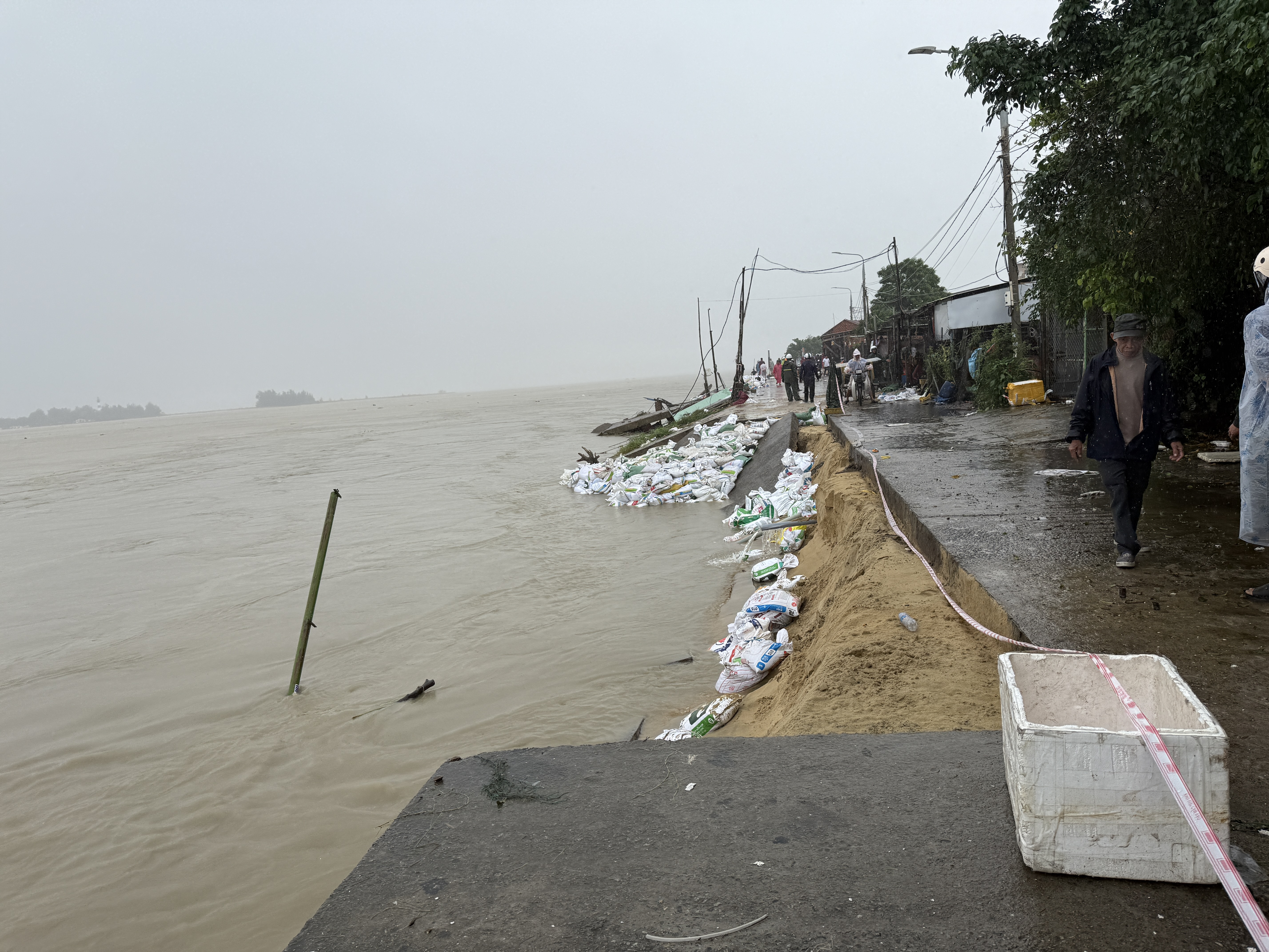 Ông Nguyễn Văn Trúc (thôn Thuận An, xã Duy Nghĩa, TP Đà Nẵng) cho biết, "gần 1 tuần qua, người dân chúng tôi đã vận động nhau cùng với các lực lượng luân phiên dùng bao cát để cứu bờ kè. Dù biết muối bỏ bể nhưng vẫn cố gắng hết mức, giữ được chừng nào thì giữ. Giờ chỉ mong trên thượng nguồn bớt mưa để nước đổ về ít hơn, giữ lại được đoạn kè vừa đắp”.