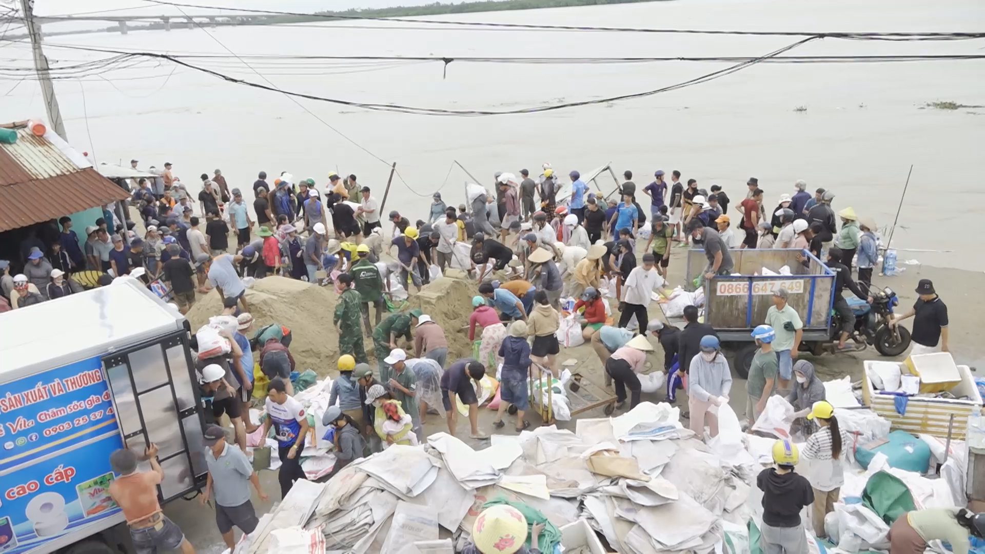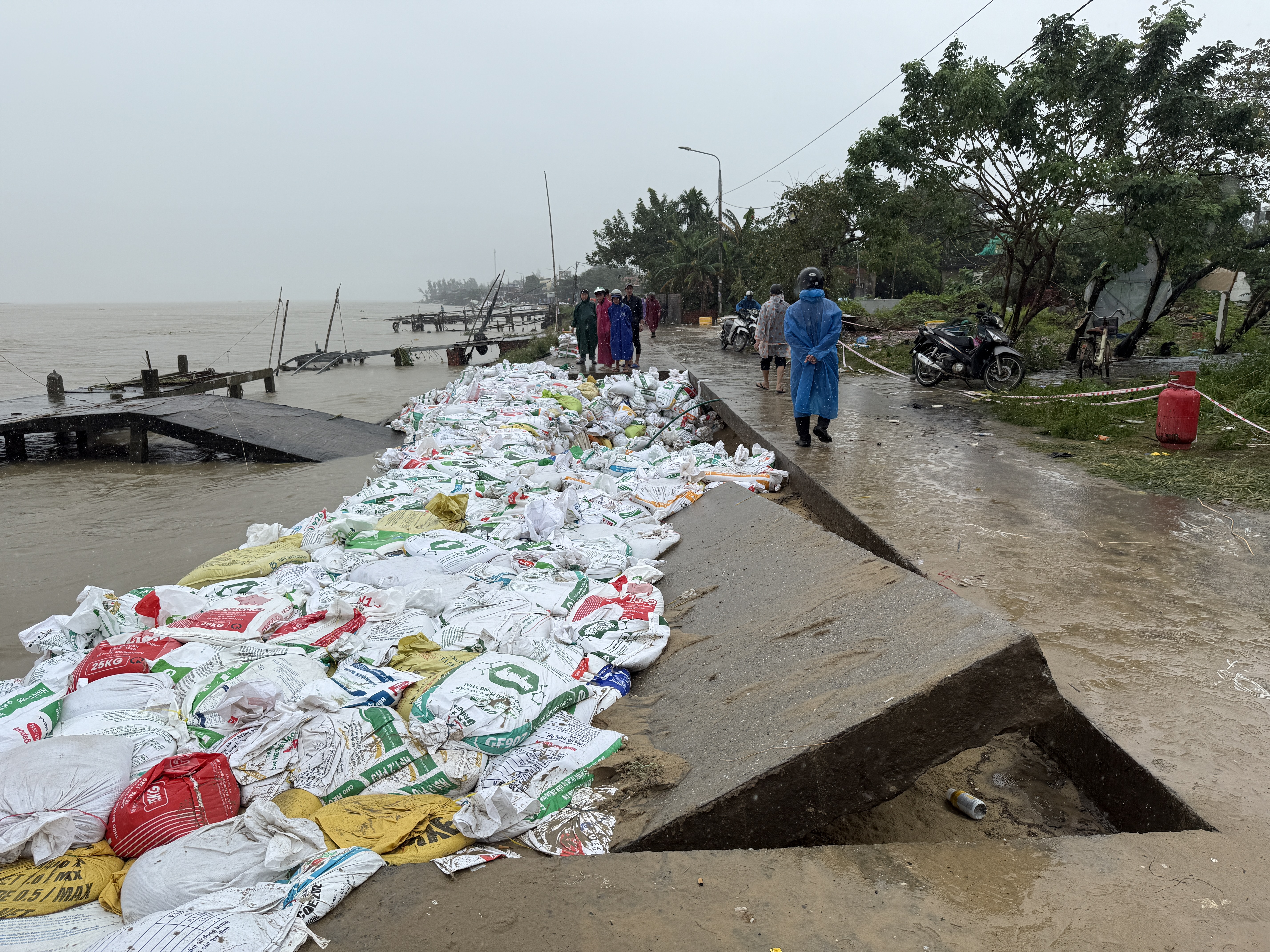 Hàng chục ngàn bao tải cát được người dân và các lực lượng vận chuyển để gia cố các điểm sạt lở