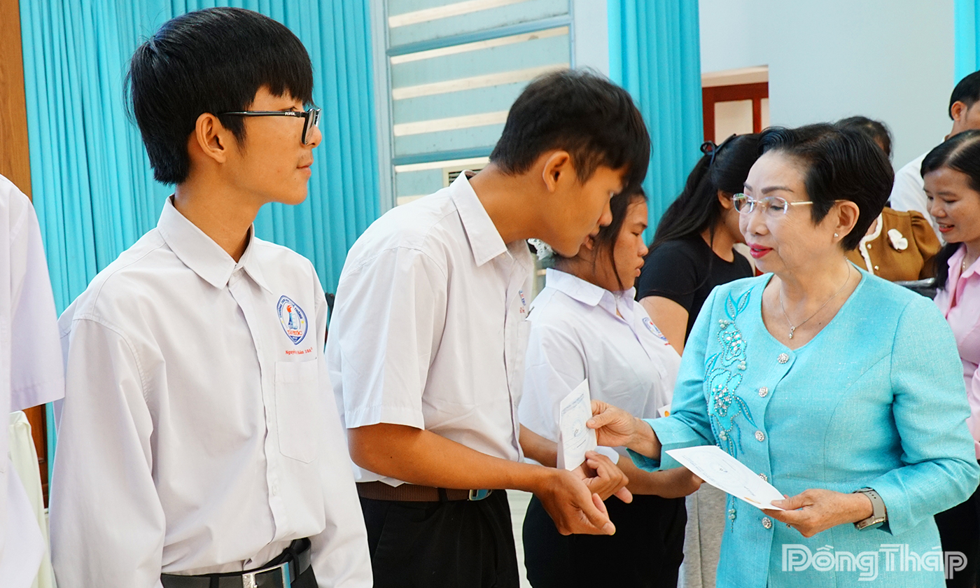 Phó Giáo sư, Tiến sĩ Trương Thị Hiền, Phó Chủ tịch Hội Khuyến học Việt Nam trao học bổng cho học sinh có hoàn cảnh khó khăn.