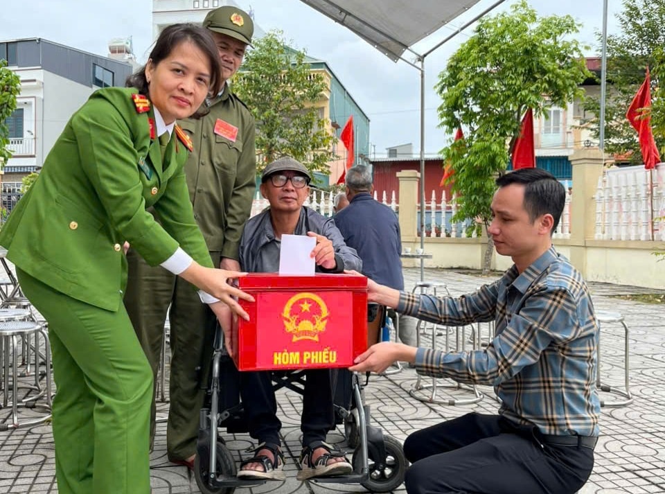 Các lực lượng thực hiện nhiệm vụ tại khu vực bỏ phiếu của thôn Hội Xuyên 2, xã Gia Lộc hỗ trợ người khuyết tật bỏ phiếu bằng hòm phiếu phụ. Ảnh: Nguyễn Hạnh