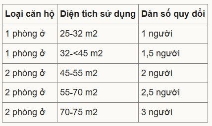 Khi tiến hành thẩm định dự án và cấp phép xây dựng, dân số sẽ được xác định cụ thể dựa trên số phòng và diện tích sử dụng căn hộ. Đối với loại hình căn hộ thương mại, số người ở được quy đổi như sau: