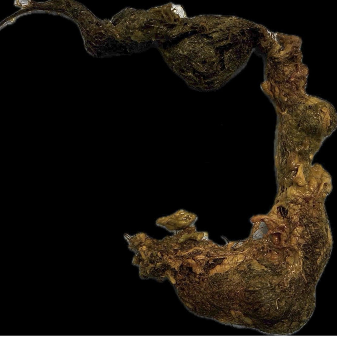 Khối tóc to và dày đóng thành khuôn cứng trong bụng gây tắc ruột bệnh nhi 9 tuổi. Ảnh:FV