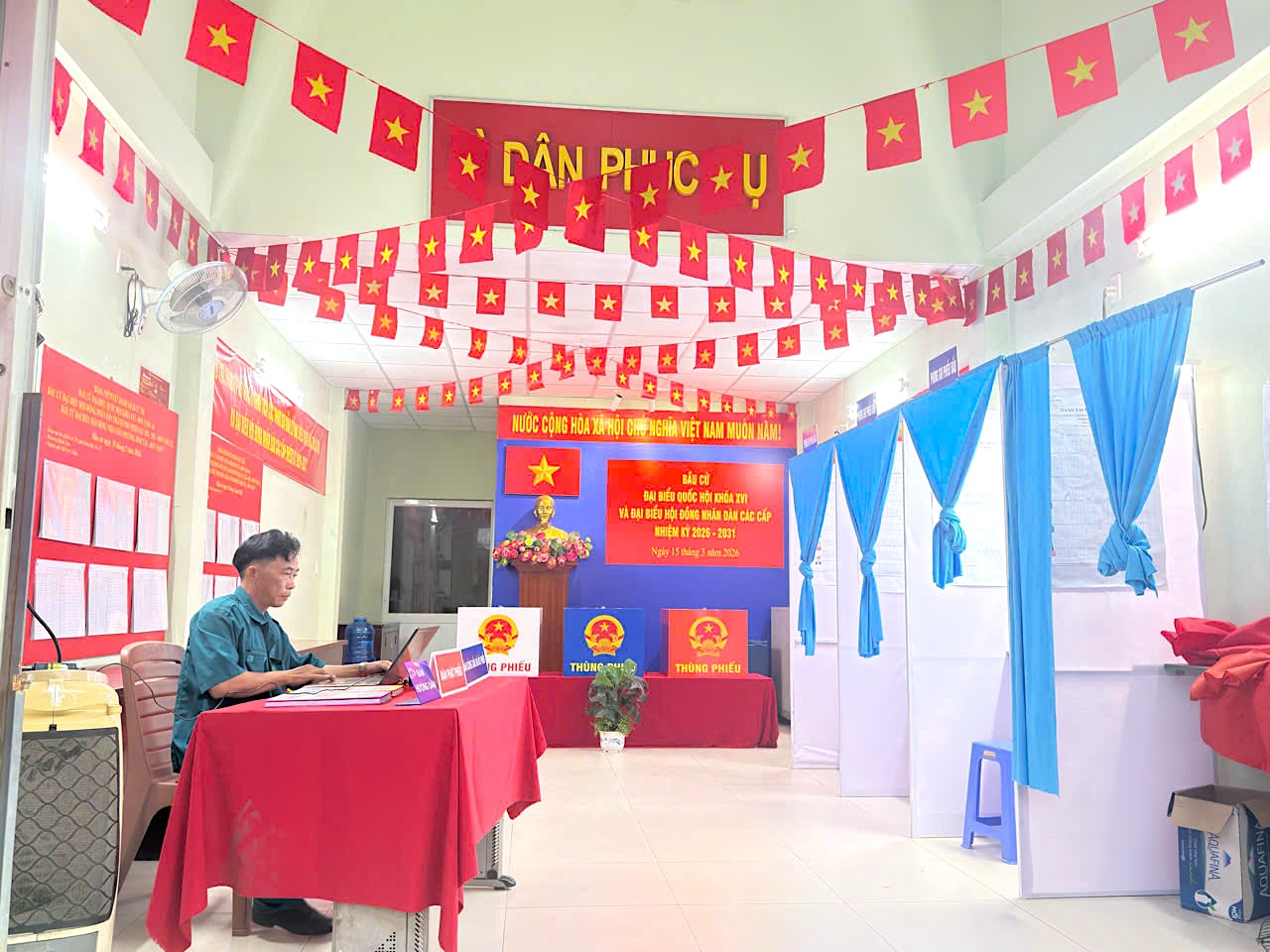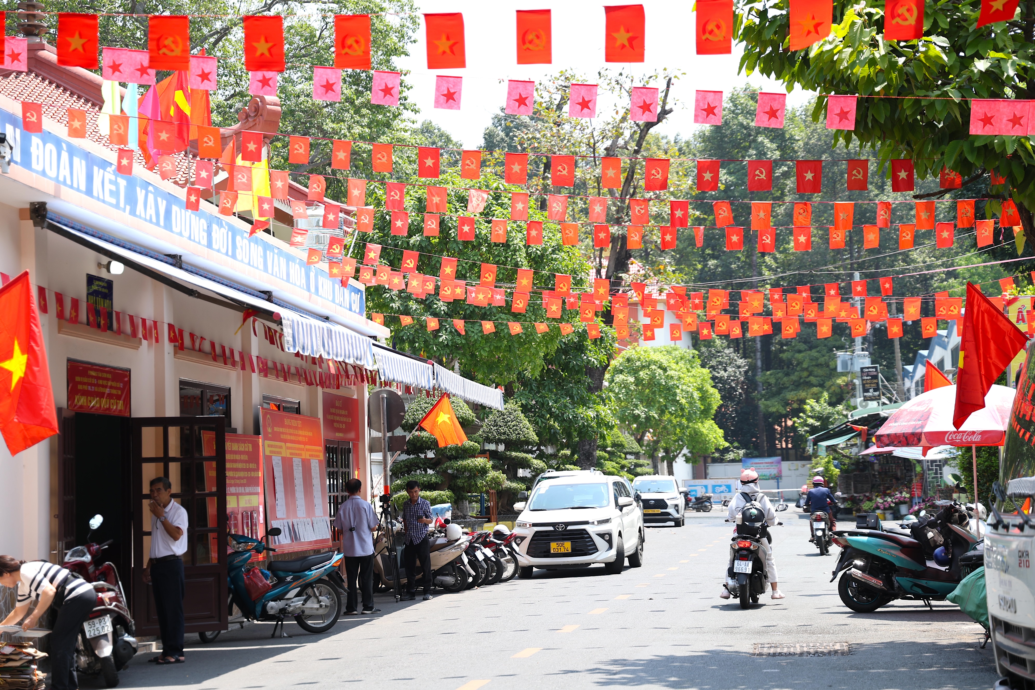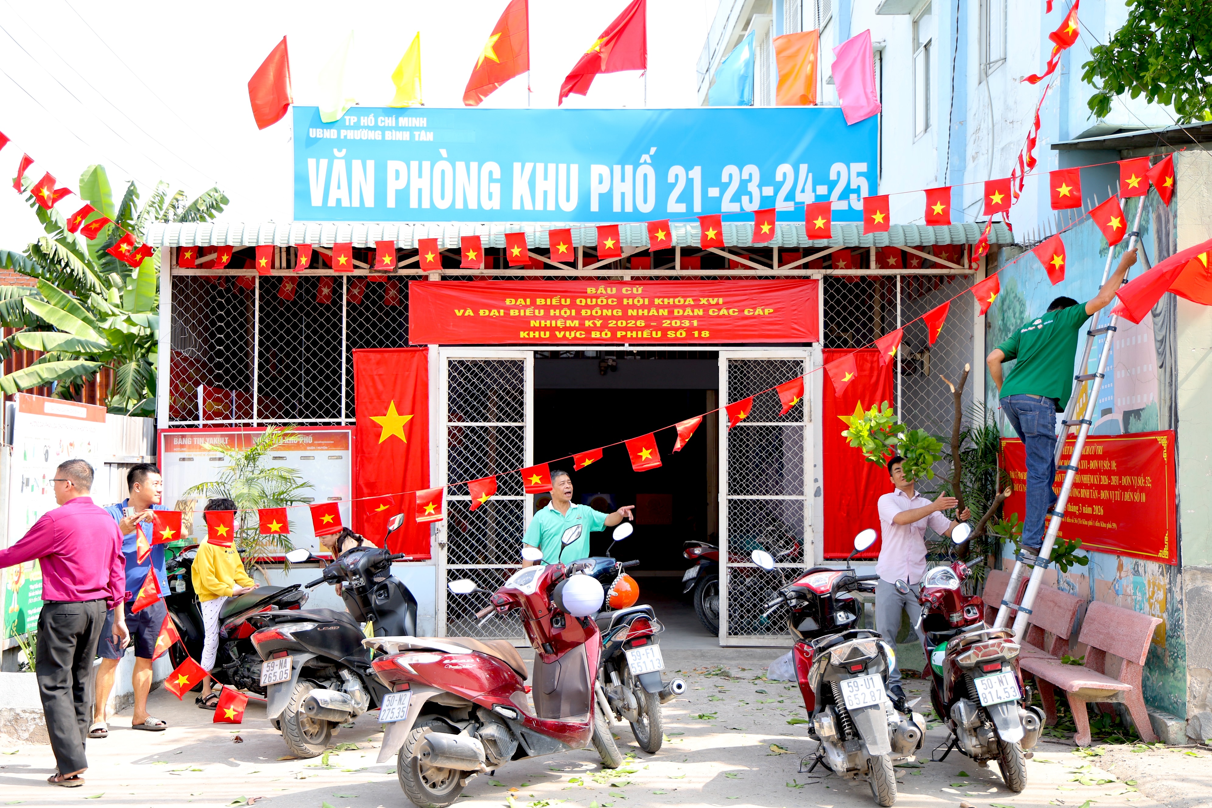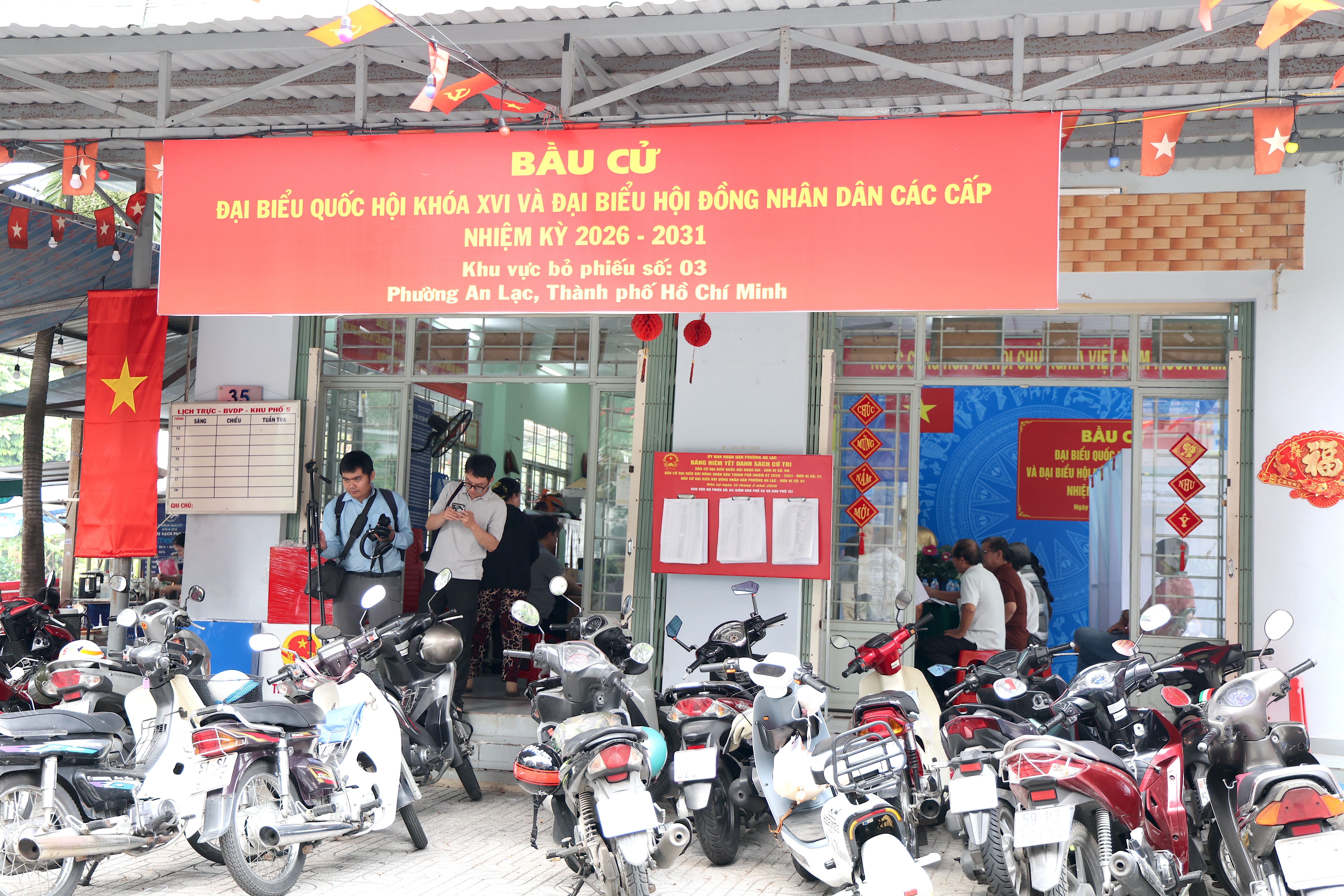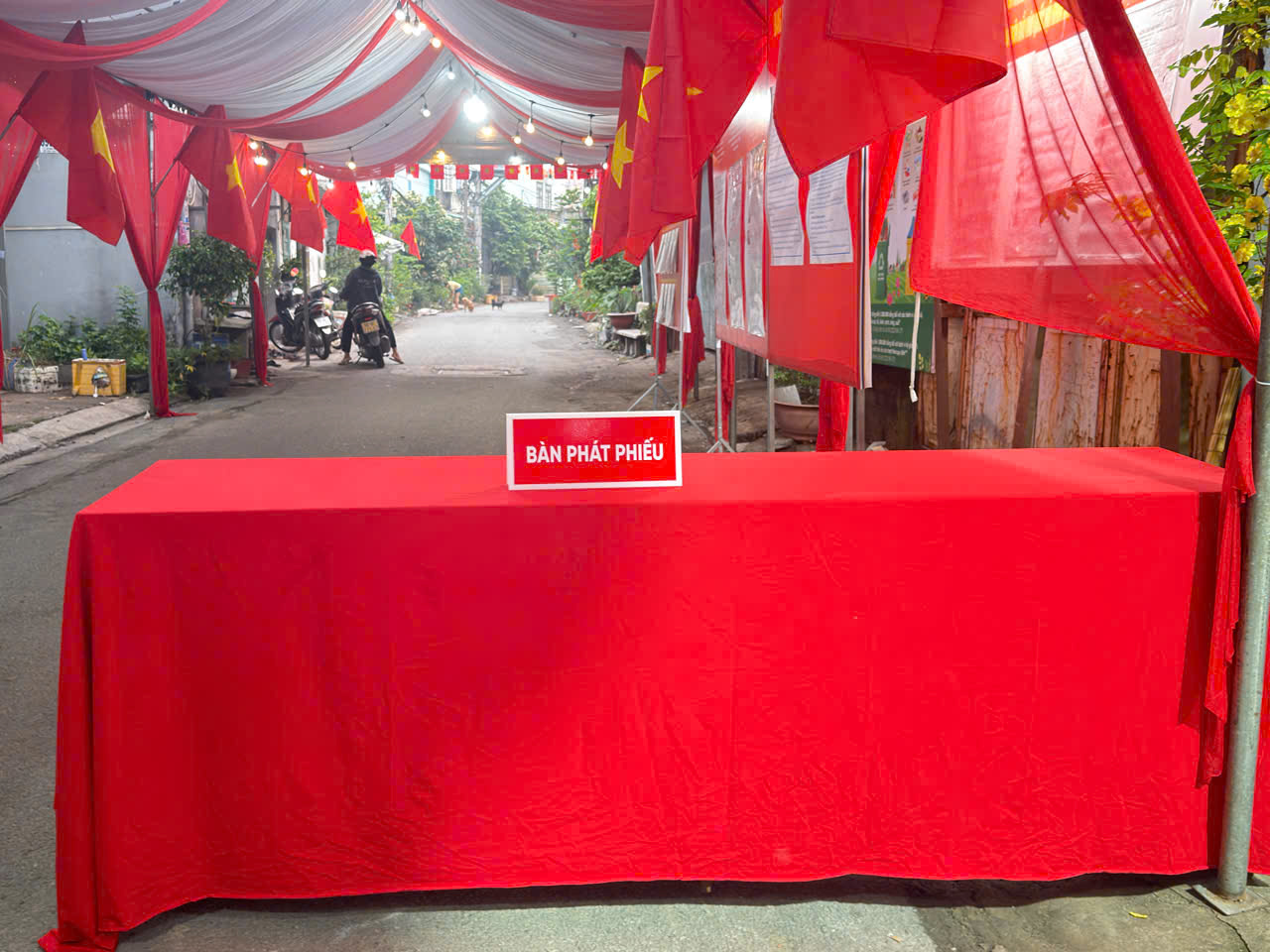Có mặt tại một con hẻm thuộc phường Bình Tân, TP.HCM, chúng tôi bắt gặp hình ảnh một “rạp cưới” với rực rỡ cờ đỏ sao vàng và dòng chữ “điểm bầu cử đại biểu Quốc hội khóa XVI và đại biểu HĐND các cấp nhiệm kỳ 2026-2031”.