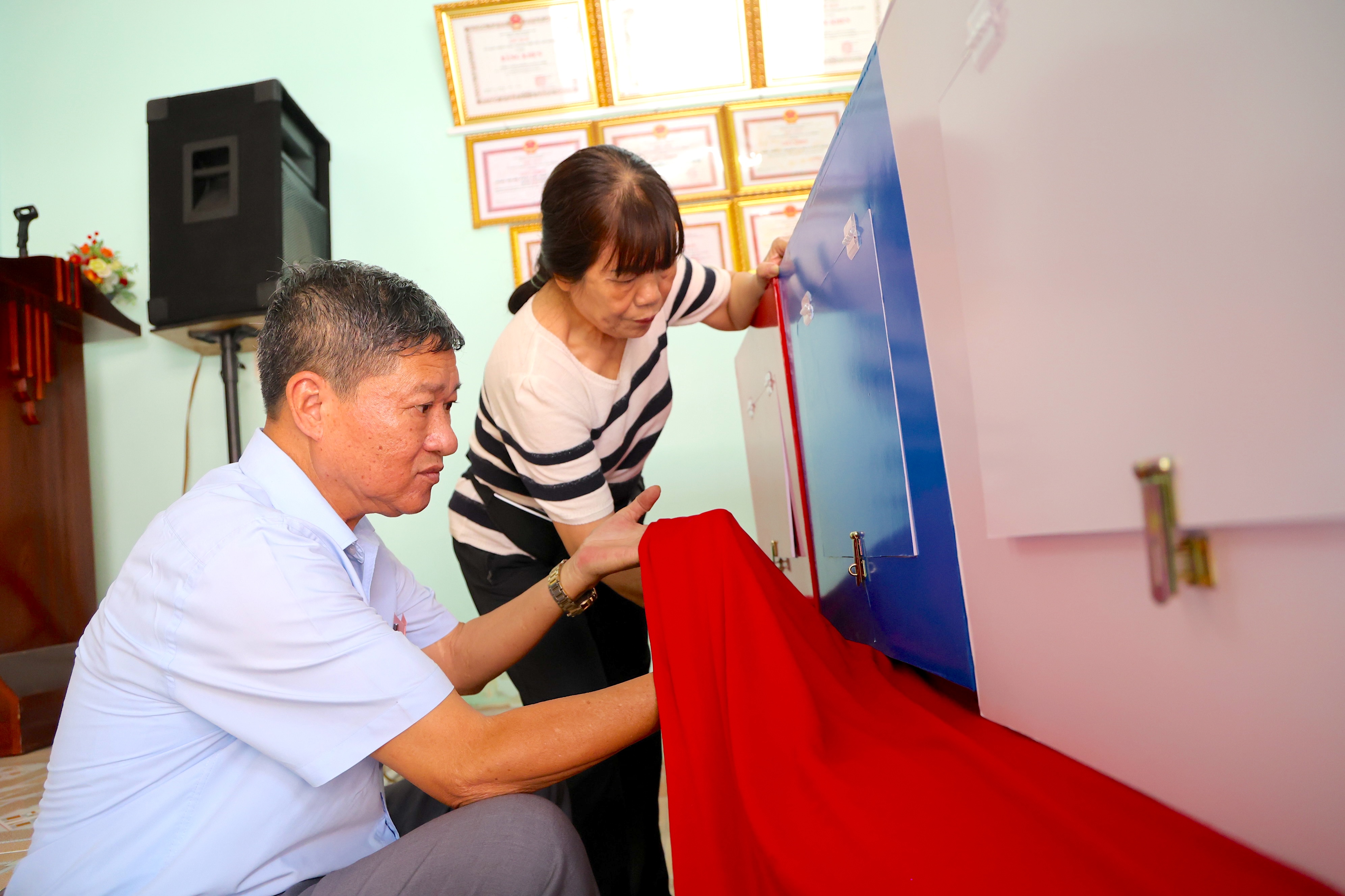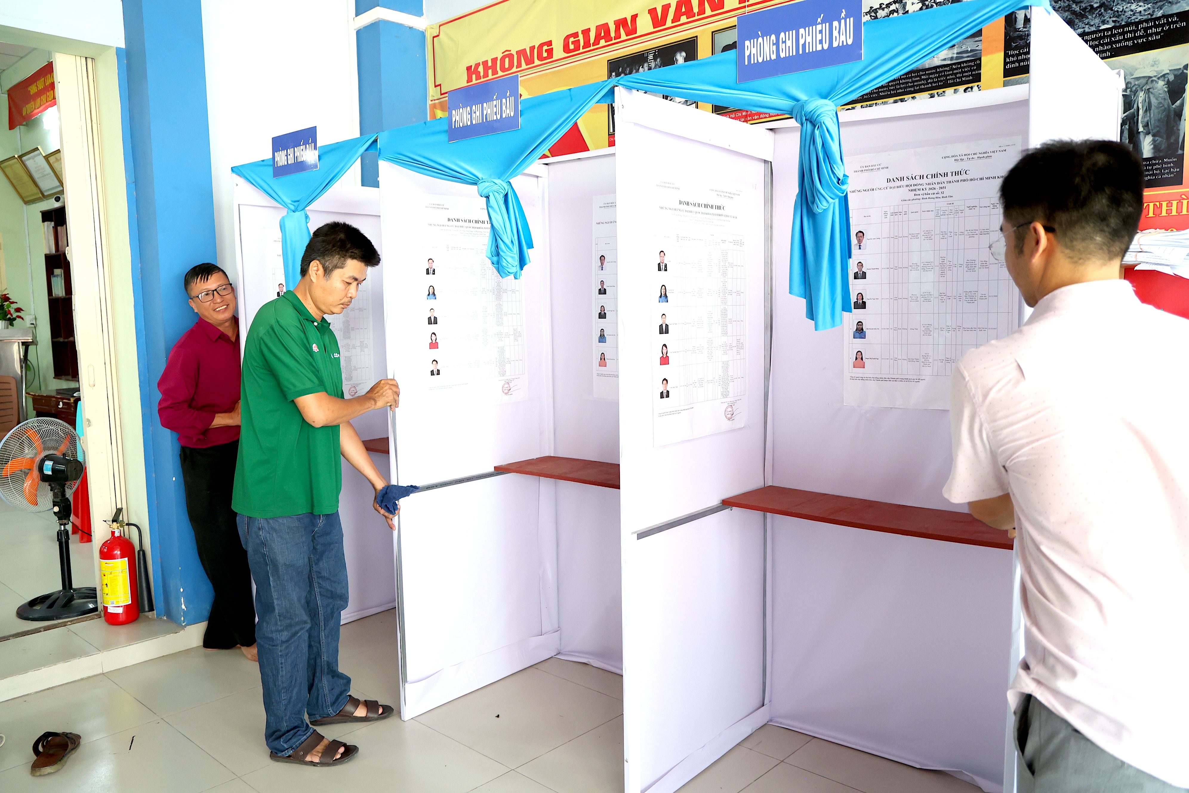 Tại phường An Lạc, không khí cũng rất sôi động. Bên trong điểm bầu cử số 1, các thành viên đang hoàn thiện những khâu cuối như dán danh sách ứng cử viên, lau chùi thùng phiếu.