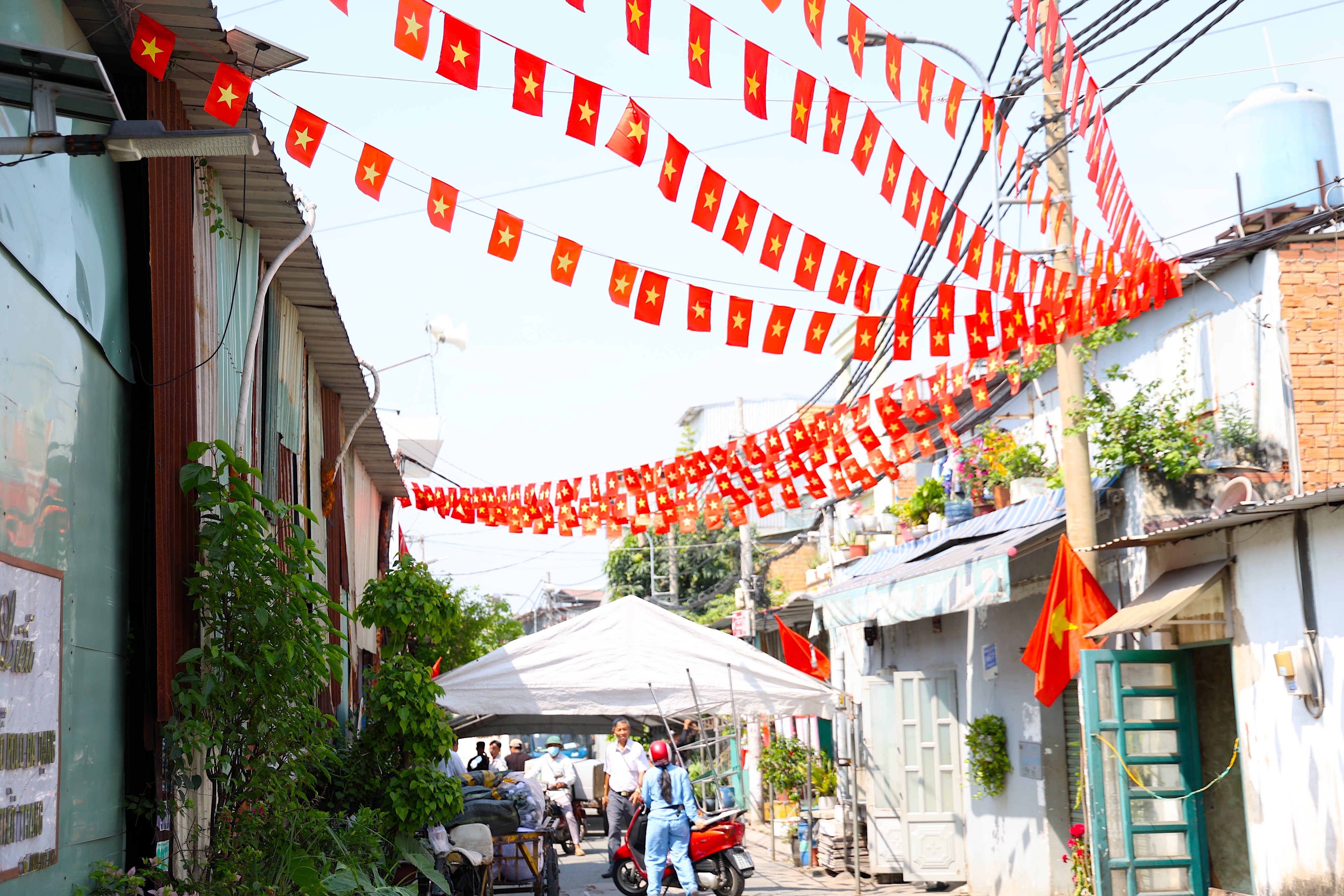 Con hẻm nhỏ trước trụ sở khu phố bừng sáng khi rạp bắt đầu dựng lên. Ảnh: LÊ THOA