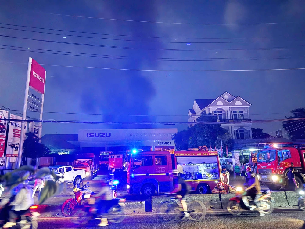 Đến hơn 19 giờ ngày 1-1-2026, lực lượng chức năng xã Xuân Thới Sơn (huyện Hóc Môn cũ) phối hợp với Cảnh sát PCCC&CNCH Công an TP.HCM đã cơ bản khống chế được ngọn lửa bên trong showroom ô tô nằm trên đường Lê Quang Đạo (Quốc lộ 22 cũ.