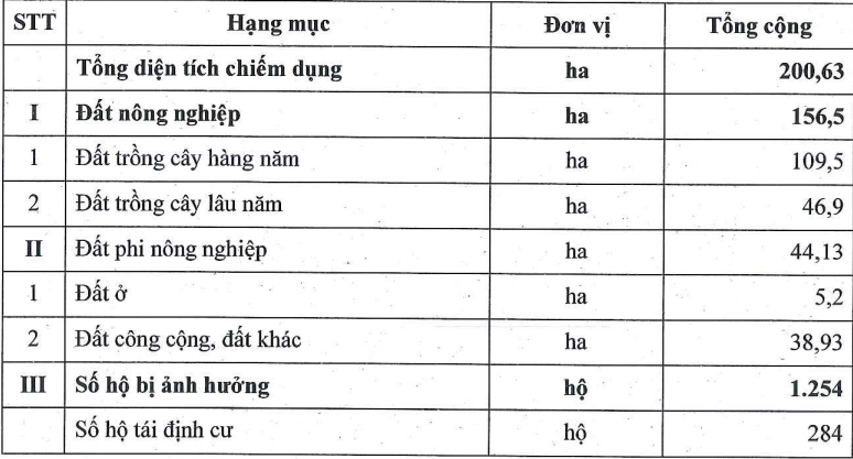 Về hiện trạng sử dụng đất, tổng diện tích đất chiếm dụng để thực hiện dự án khoảng 200,63 ha. Theo thống kê sơ bộ, có khoảng 1.254 hộ dân bị ảnh hưởng bởi quá trình thu hồi đất. Khu vực triển khai dự án hiện có mật độ dân cư tập trung đông đúc dọc theo các tuyến đường hiện hữu, chủ yếu là các hộ kinh doanh nhỏ lẻ và khu dân cư ổn định lâu đời.
