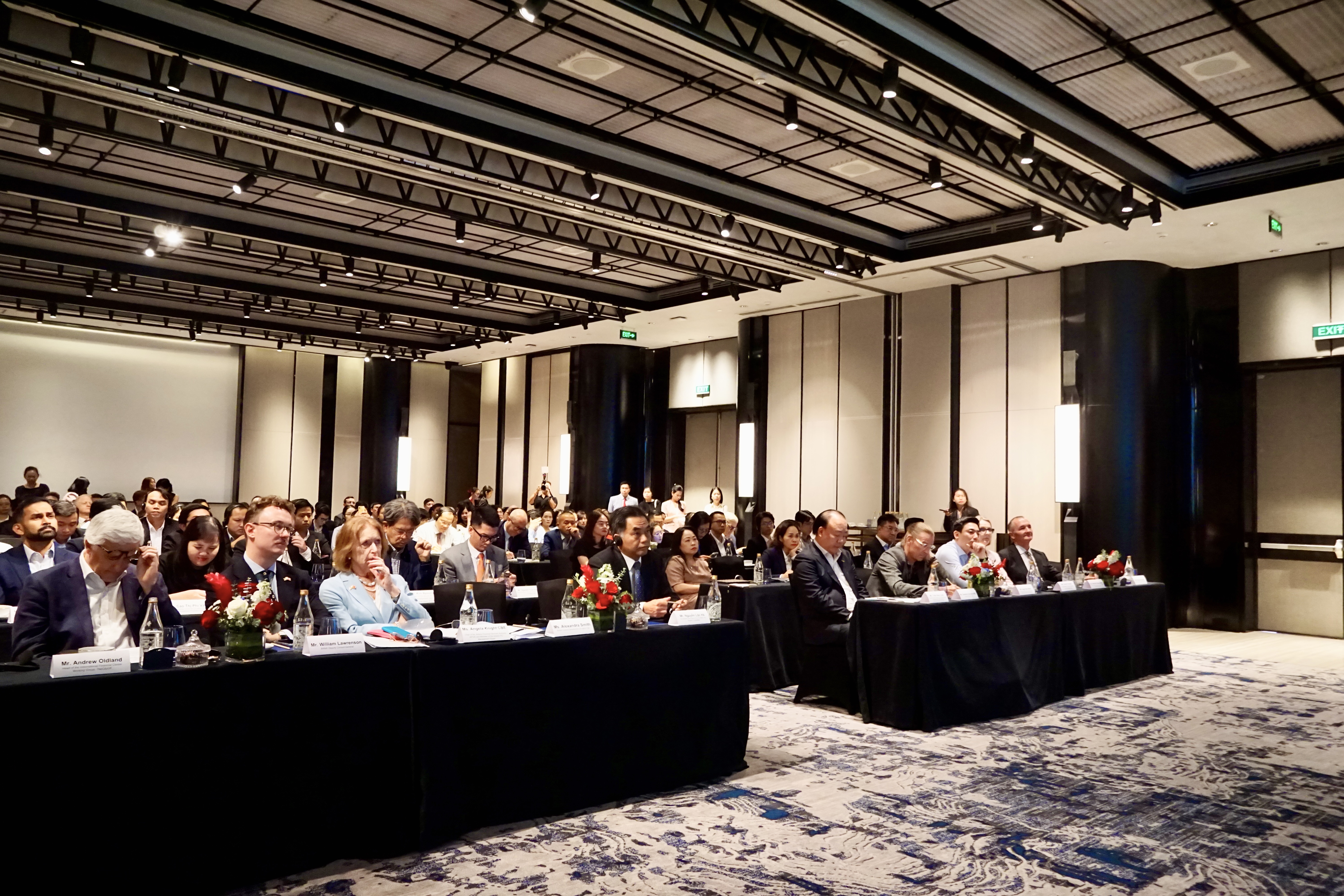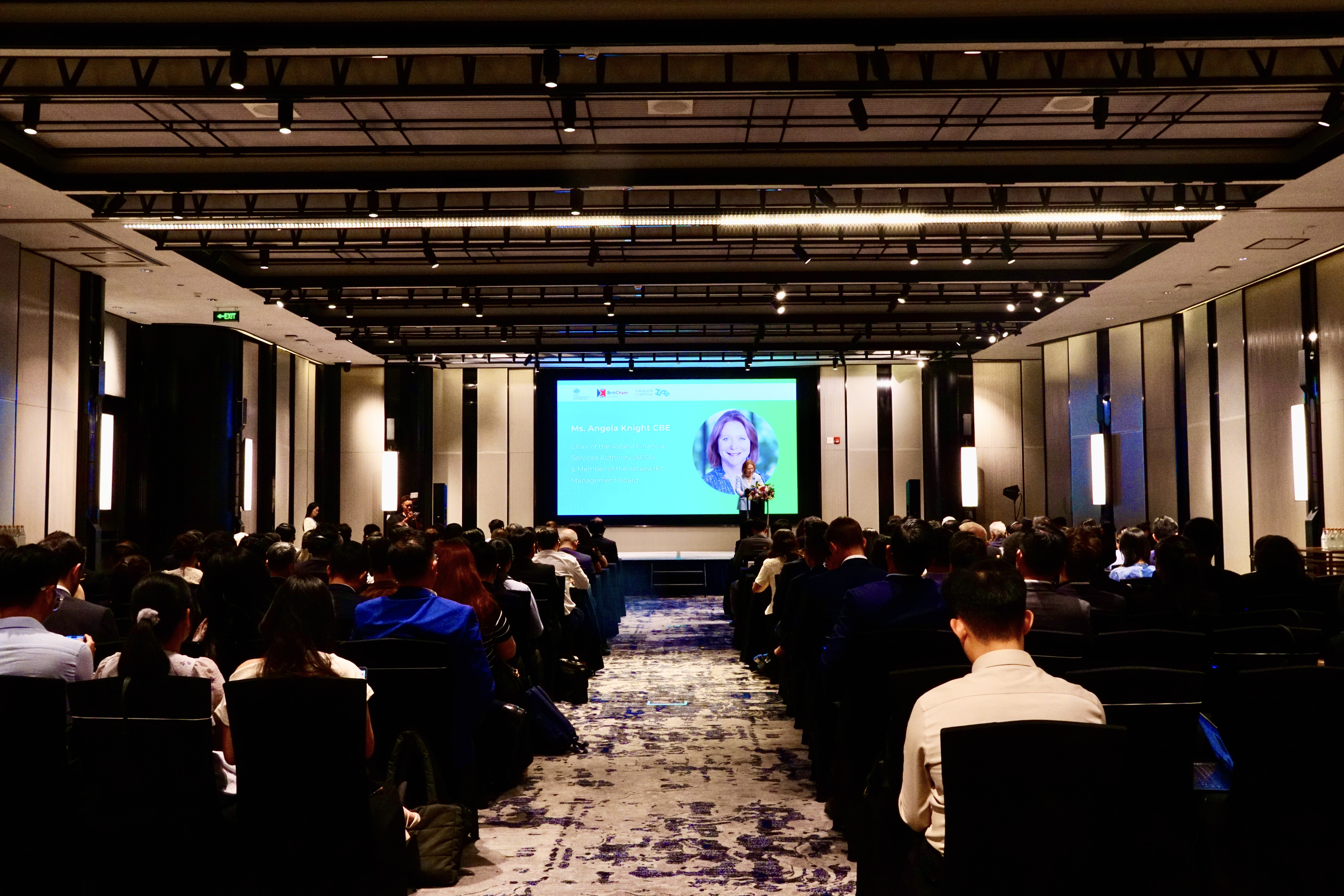 Các đại biểu lắng nghe chia sẻ của bà Angela Knight, Chủ tịch Hội đồng Quản trị Cơ quan Dịch vụ Tài chính Astana (AFSA). Ảnh: DƯƠNG KHANG