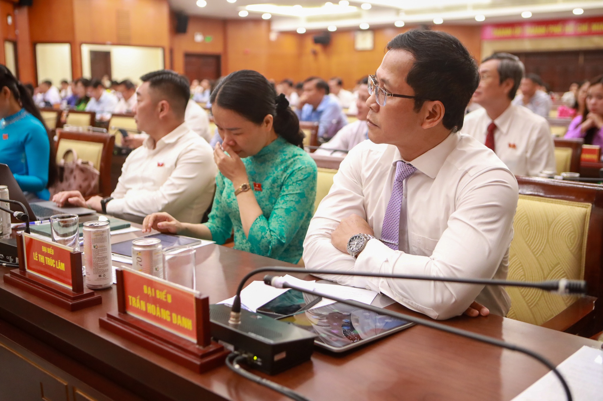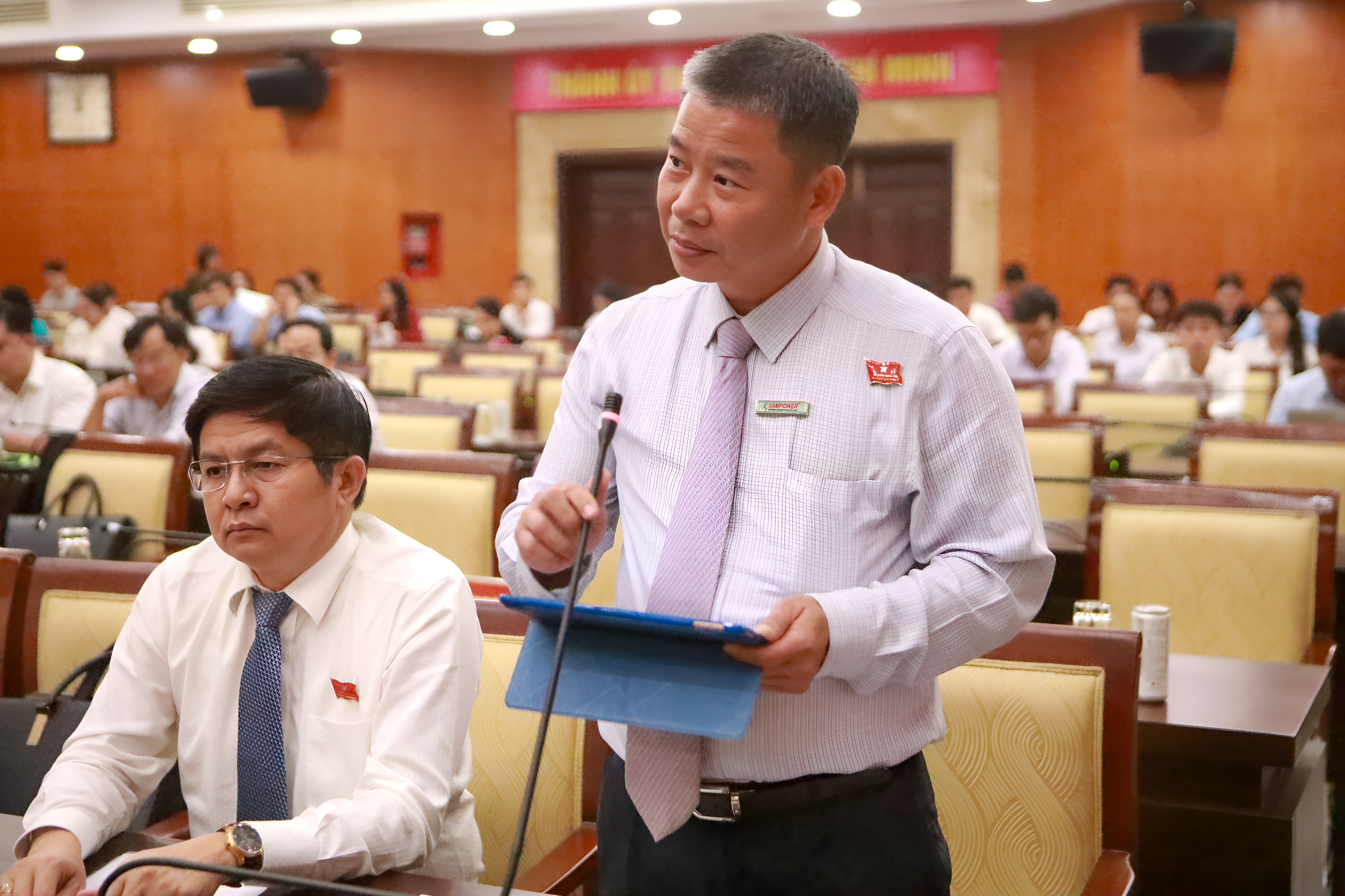 Đại biểu Trần Hoàng Danh (bên phải) đặt câu hỏ về tiến độ dự án chống ngập quy mô 10.000 tỷ đồng của thành phố.
