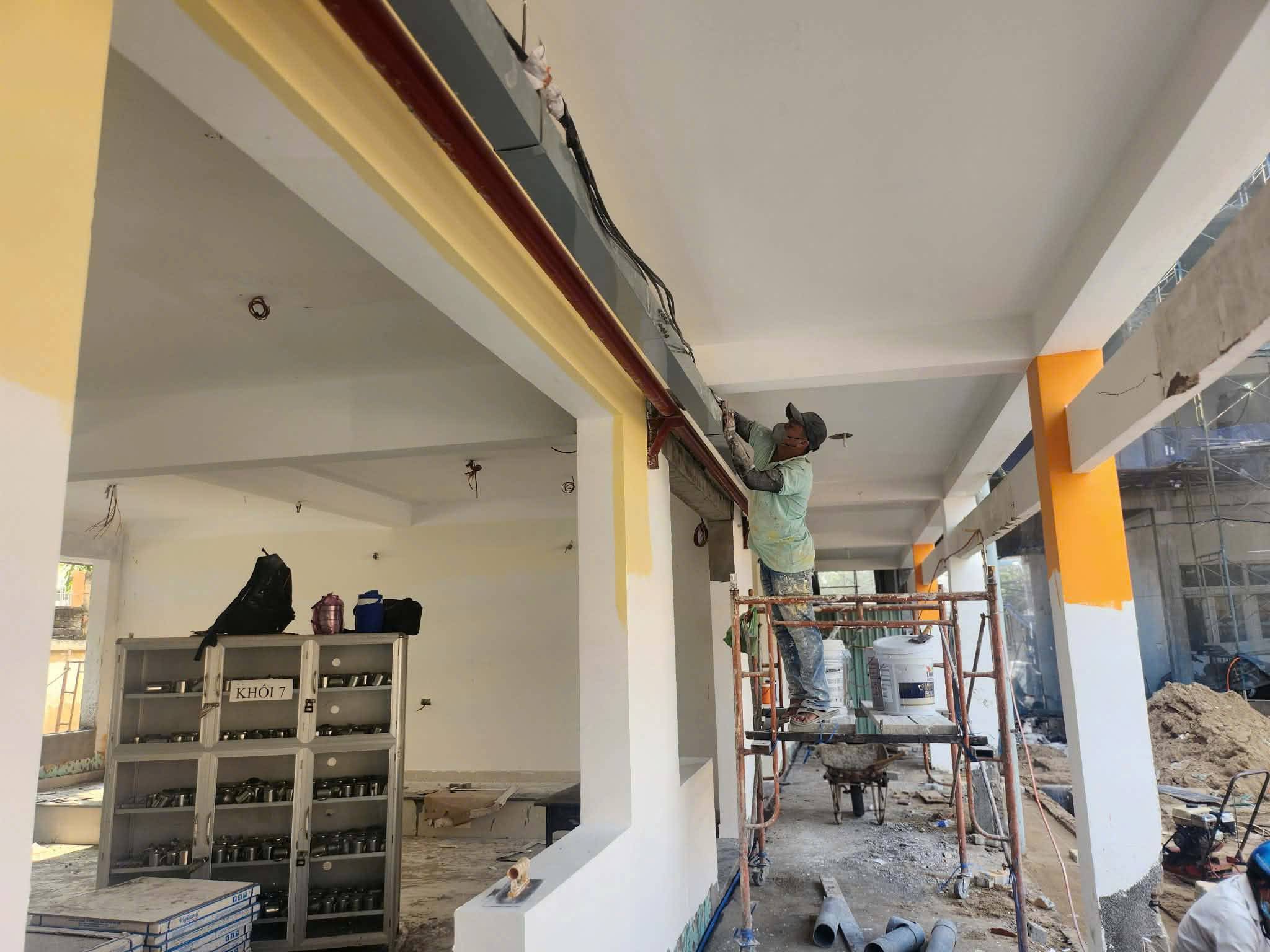 Công nhân đang sơn khu phòng học cải tạo. Ảnh: NQ