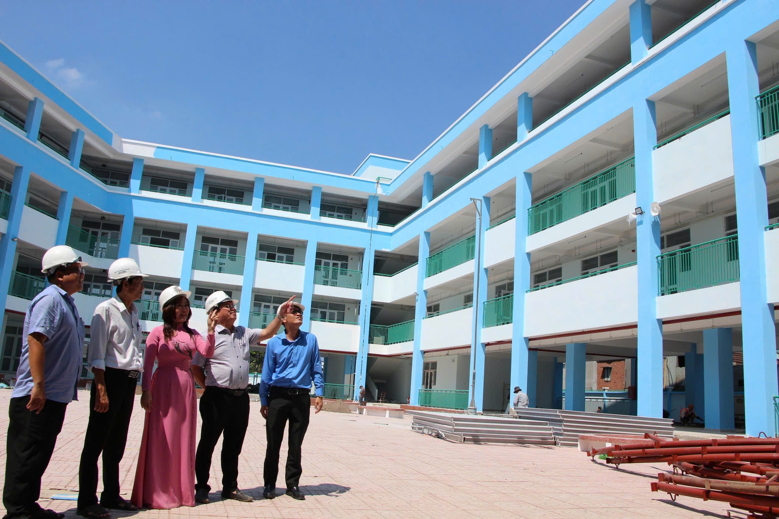 Ông Trần Minh Kha, Hiệu trưởng Trường THPT Hoàng Thế Thiện (thứ hai từ trái qua) ra công trình kiểm tra tiến độ thi công. Ảnh: ĐH
