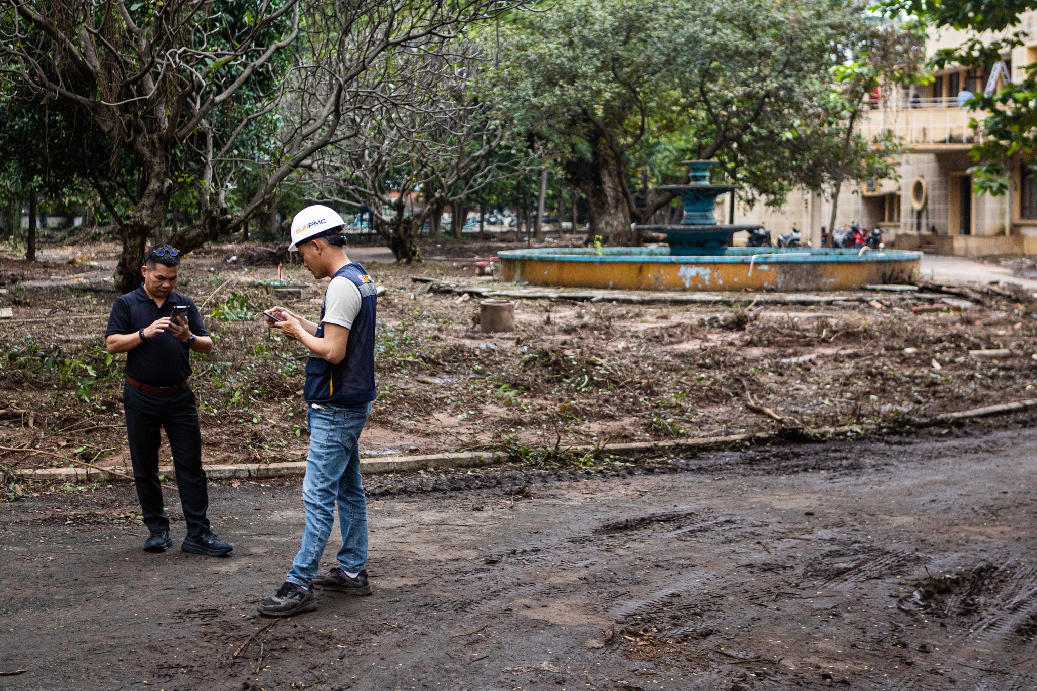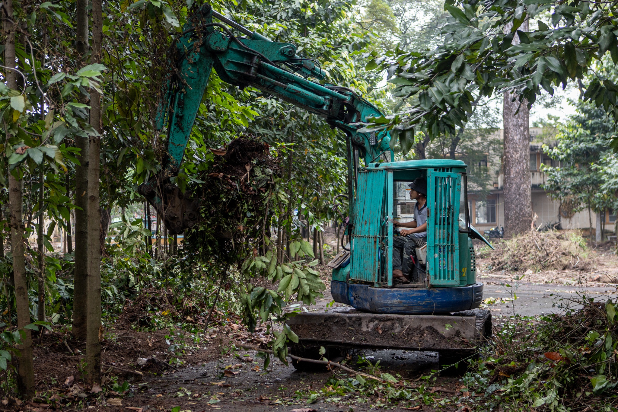 Ghi nhận chiều 6/11, nhiều xe cẩu, công nhân tiến hành phát quang bụi rậm, dọn sạch rác, đất cát trên các lối đi và khuôn viên khu biệt thự.