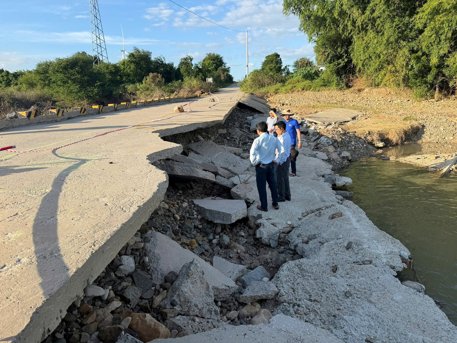 Tại xã Thuận Nam, hệ thống đường nội thôn Phước Lập - Tam Lang - Văn Lâm 3 bị ngập sâu, sạt lở ở nhiều đoạn, gây ách tắc toàn tuyến. Đoàn xác định cần gia cố nền đường, xử lý các điểm sạt lở và bổ sung hệ thống thoát nước trên chiều dài hơn 3,5 km để khôi phục hoàn toàn khả năng lưu thông.