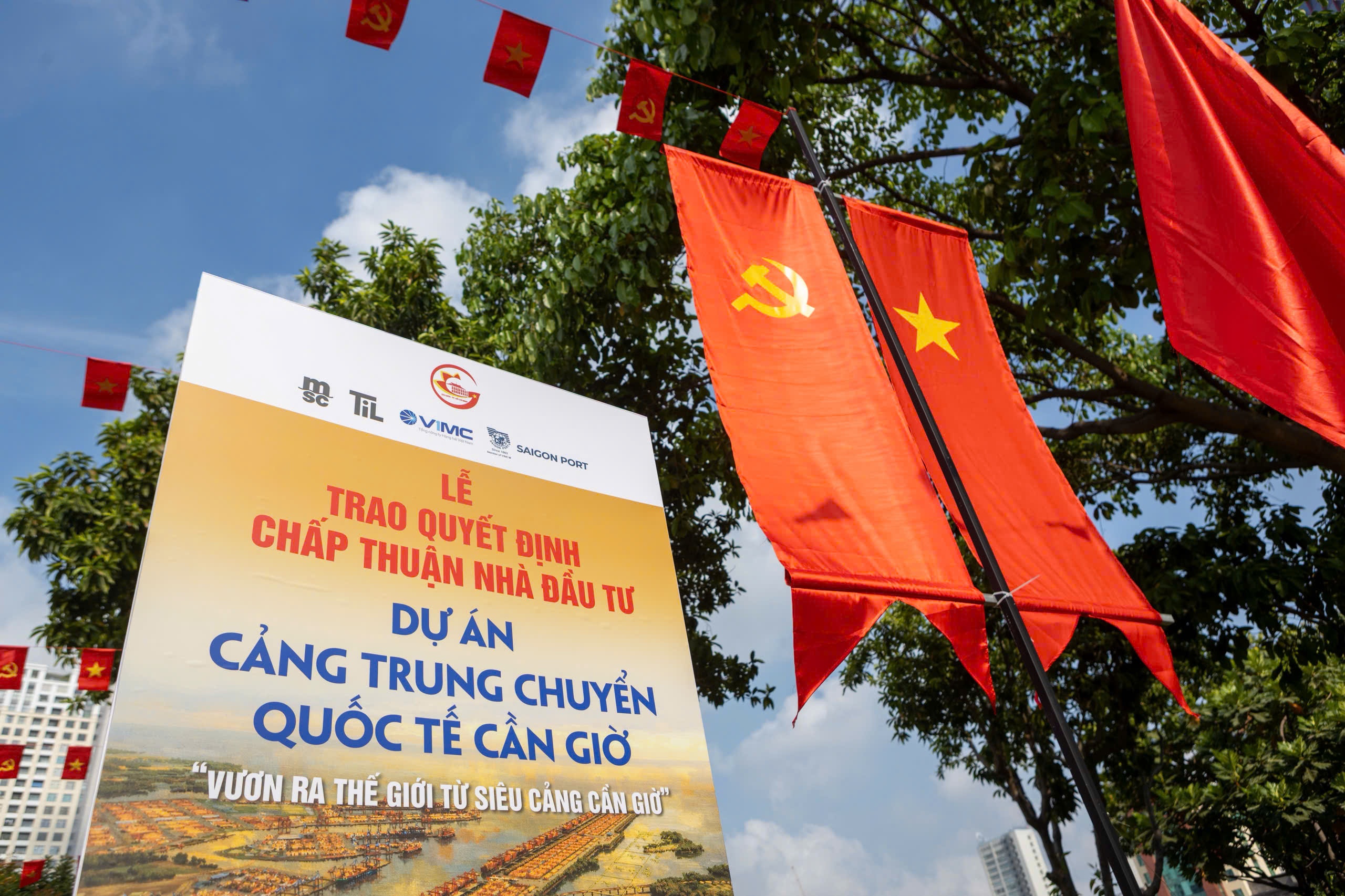 Cũng tại sự kiện này, TP.HCM sẽ trao quyết định chấp thuận nhà đầu tư dự án Cảng trung chuyển quốc tế Cần Giờ. Tham dự có đại diện liên danh chủ đầu tư gồm ông Romain Simon - Giám đốc đầu tư Công ty Đầu tư Terminal Investment Limited Holding S.A.; ông Lê Anh Sơn - Tổng giám đốc Tổng công ty Hàng hải Việt Nam; và ông Nguyễn Lê Chơn Tâm - Tổng giám đốc CTCP Cảng Sài Gòn. Ảnh: Khương Nguyễn.