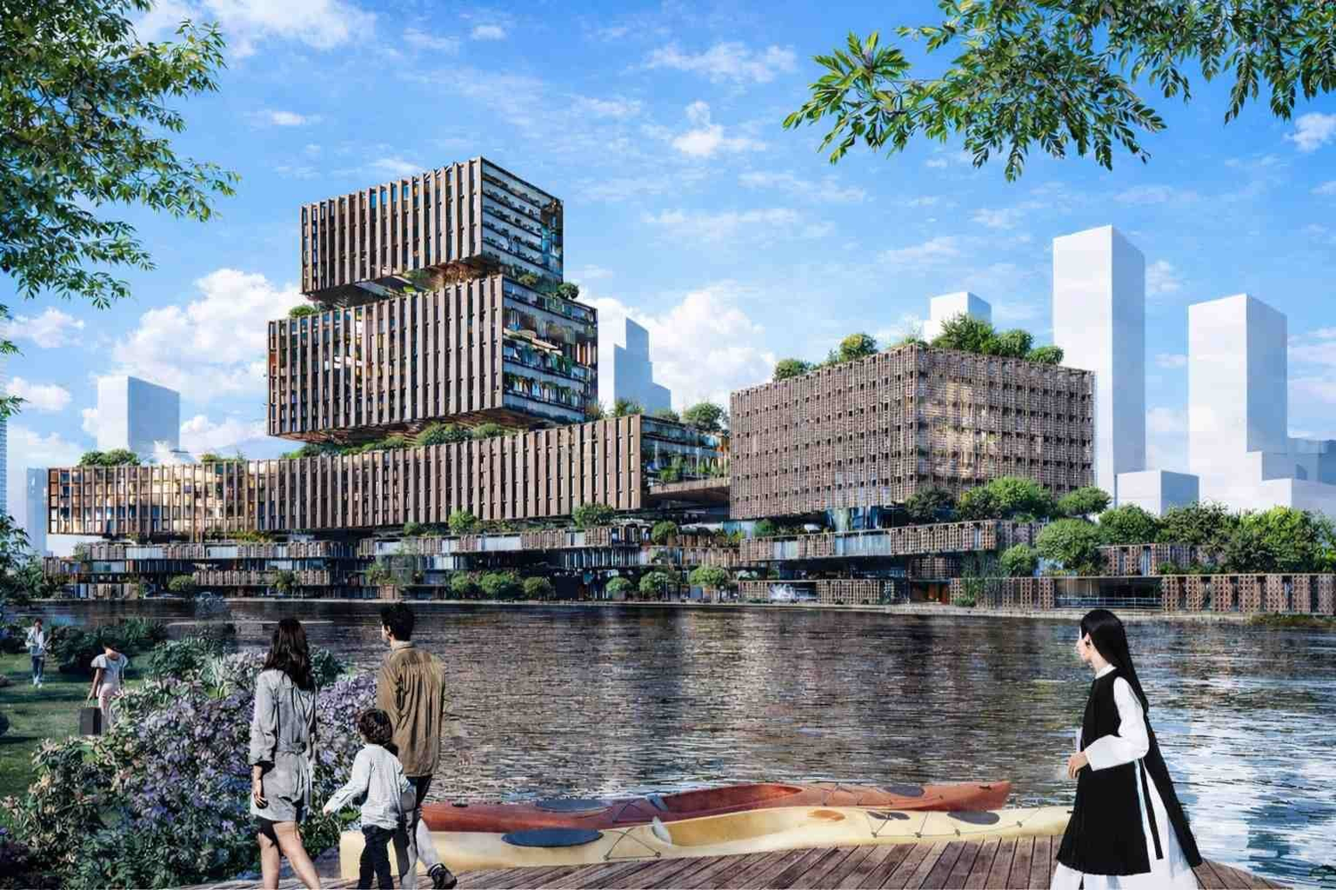 Trung tâm hành chính được bố trí tại vị trí trung tâm, với một mặt tiếp giáp quảng trường trung tâm. Mặt còn lại tiếp giáp không gian công cộng gồm cây xanh và hồ trung tâm, tạo sự kết nối giữa khu hành chính và các không gian sinh hoạt cộng đồng.