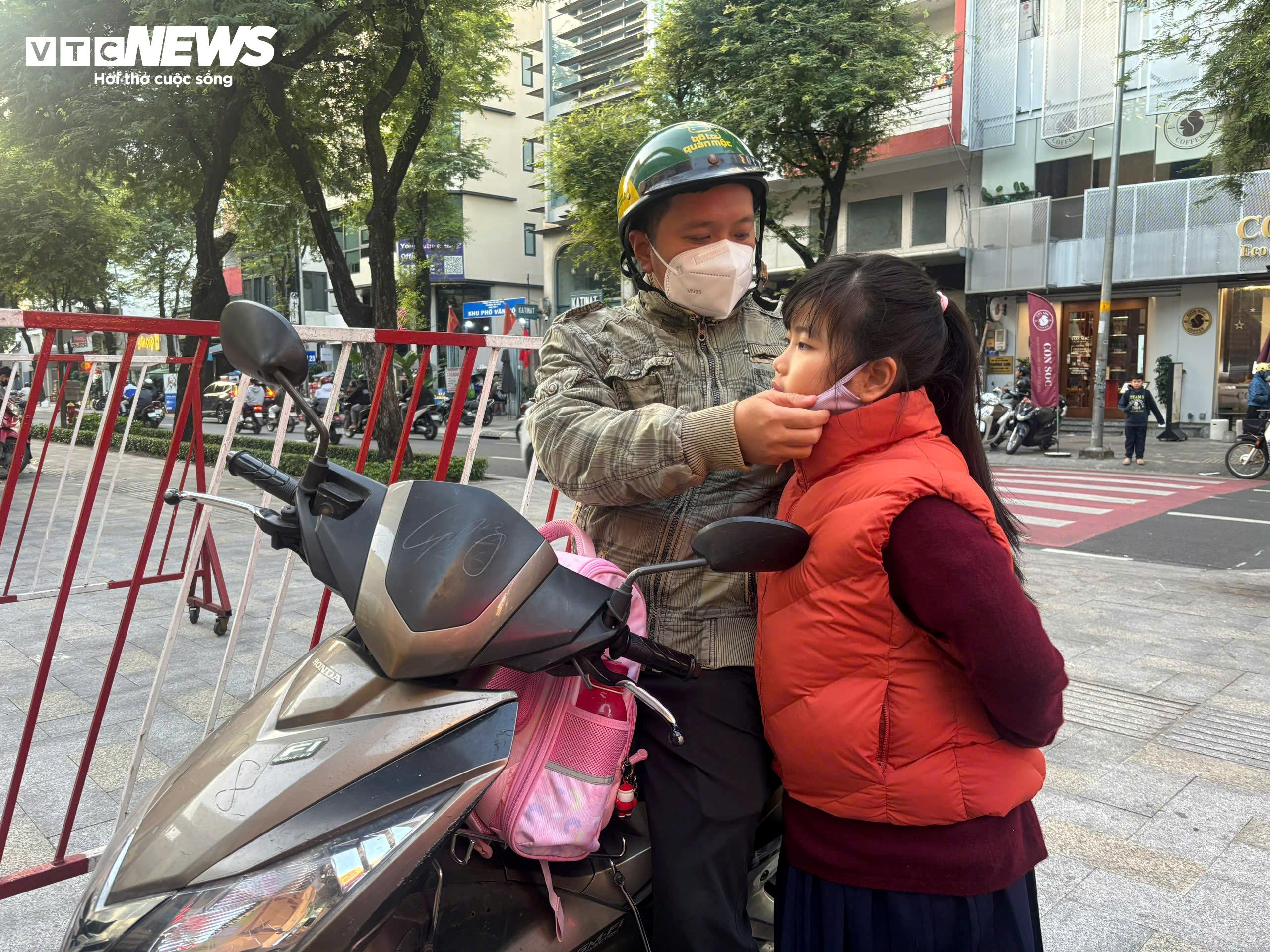 Trẻ mặc áo phao giữ ấm khi tới trường sáng nay.