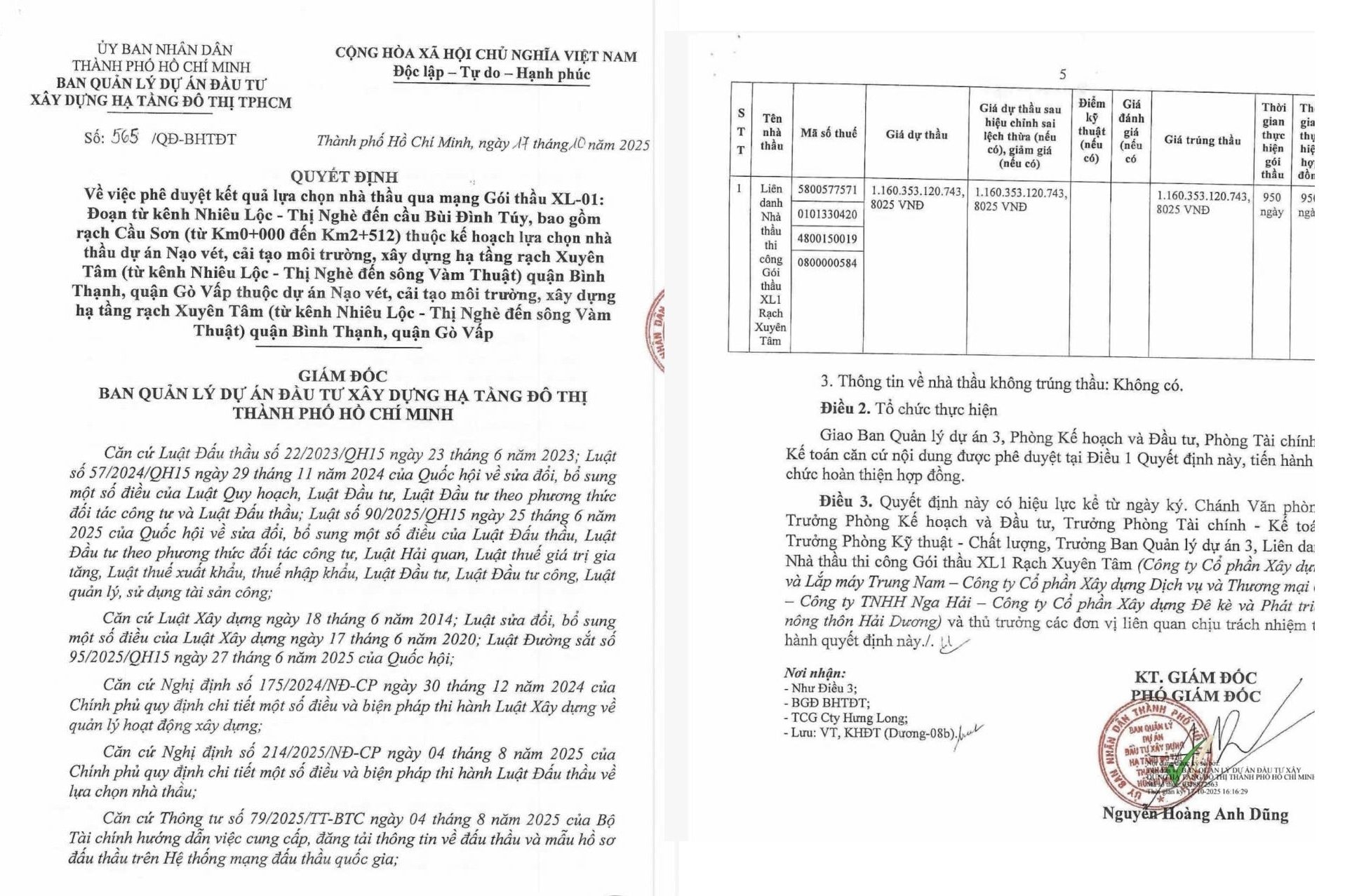 Theo đó, ngày 17/10/2025 Giám đốc Ban QLDA Đầu tư xây dựng Hạ tầng đô thị TP.HCM ký quyết định số 565/QĐ-BHTĐT về việc phê duyệt kết quả lựa chọn nhà thầu qua mạng, gói thầu XL-01 đoạn Kênh Nhiêu Lộc- Thị Nghè thuộc Dự án nạo vét, cải tạo môi trường, xây dựng hạ tầng rạch Xuyên Tâm (đoạn Nhiêu Lộc- Thị Nghè đến sông Vàm Thuật) quận Bình Thạnh, quận Gò Vấp.