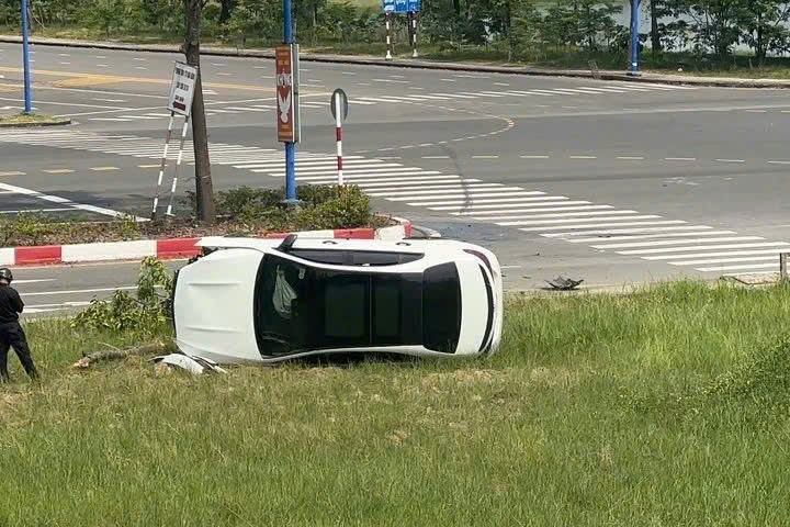 Trong lúc băng qua ngã tư với đường DC, phương tiện tông gãy cây xanh, lao lên bãi cỏ ven đường rồi lật nghiêng. Chiếc ô tô hư hỏng, bung túi khí.