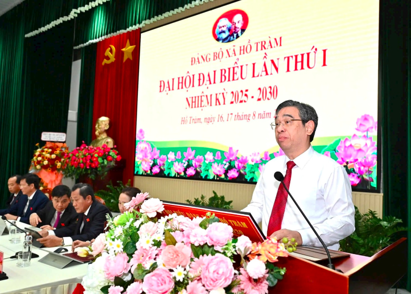Phó bí thư Thành ủy, Chủ tịch Ủy ban MTTQ Việt Nam TP.HCM Nguyễn Phước Lộc yêu cầu xã Hồ Tràm phát triển hài hòa giữa nông thôn và đô thị tại Đại hội đại biểu lần thứ I Đảng bộ xã Hồ Tràm.