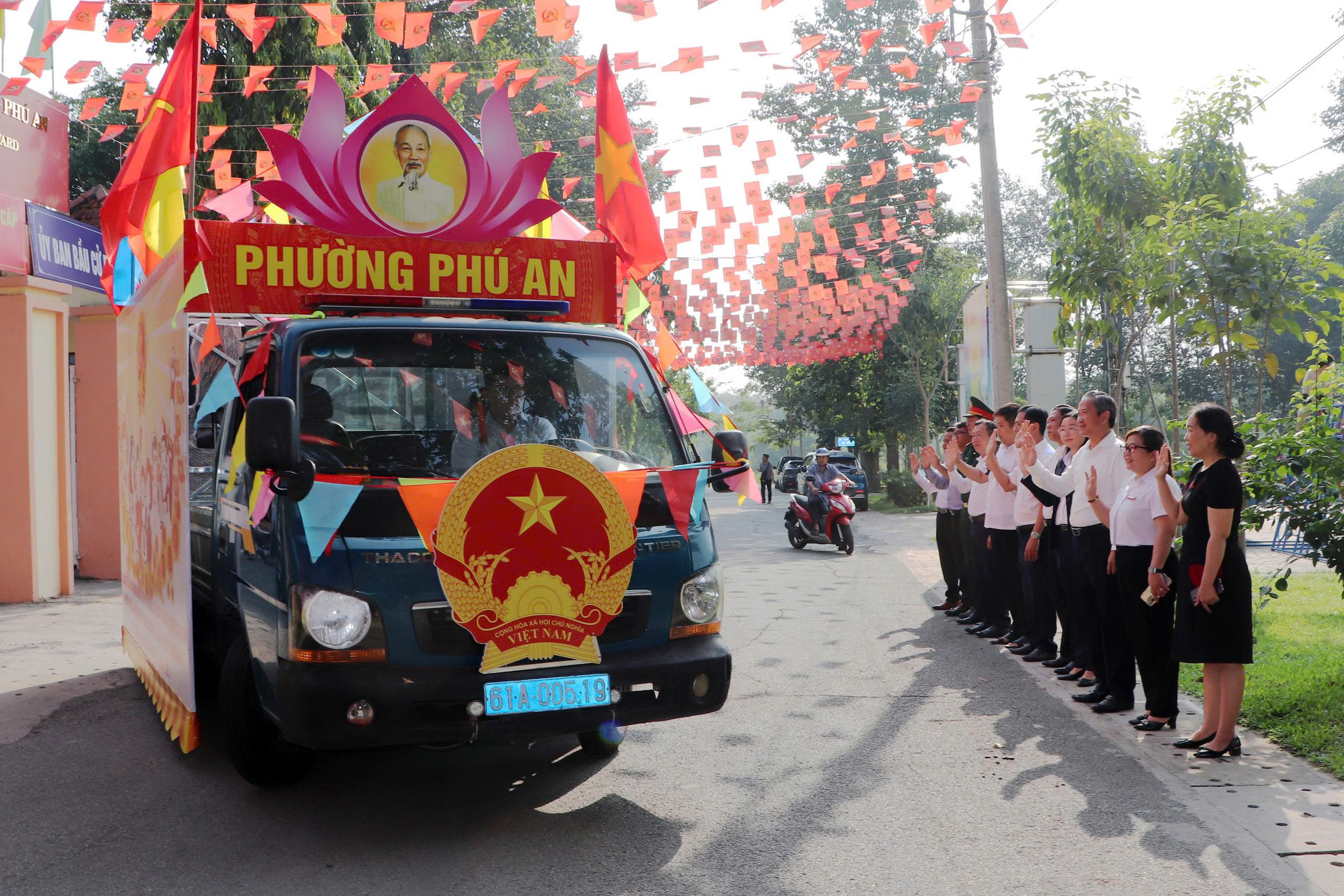 Lãnh đạo phường Phú An chào đón xe tuyên truyền cổ động, lan tỏa không khí rộn ràng trước ngày bầu cử. Ảnh: LÊ ÁNH