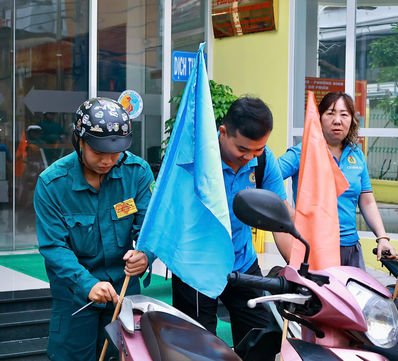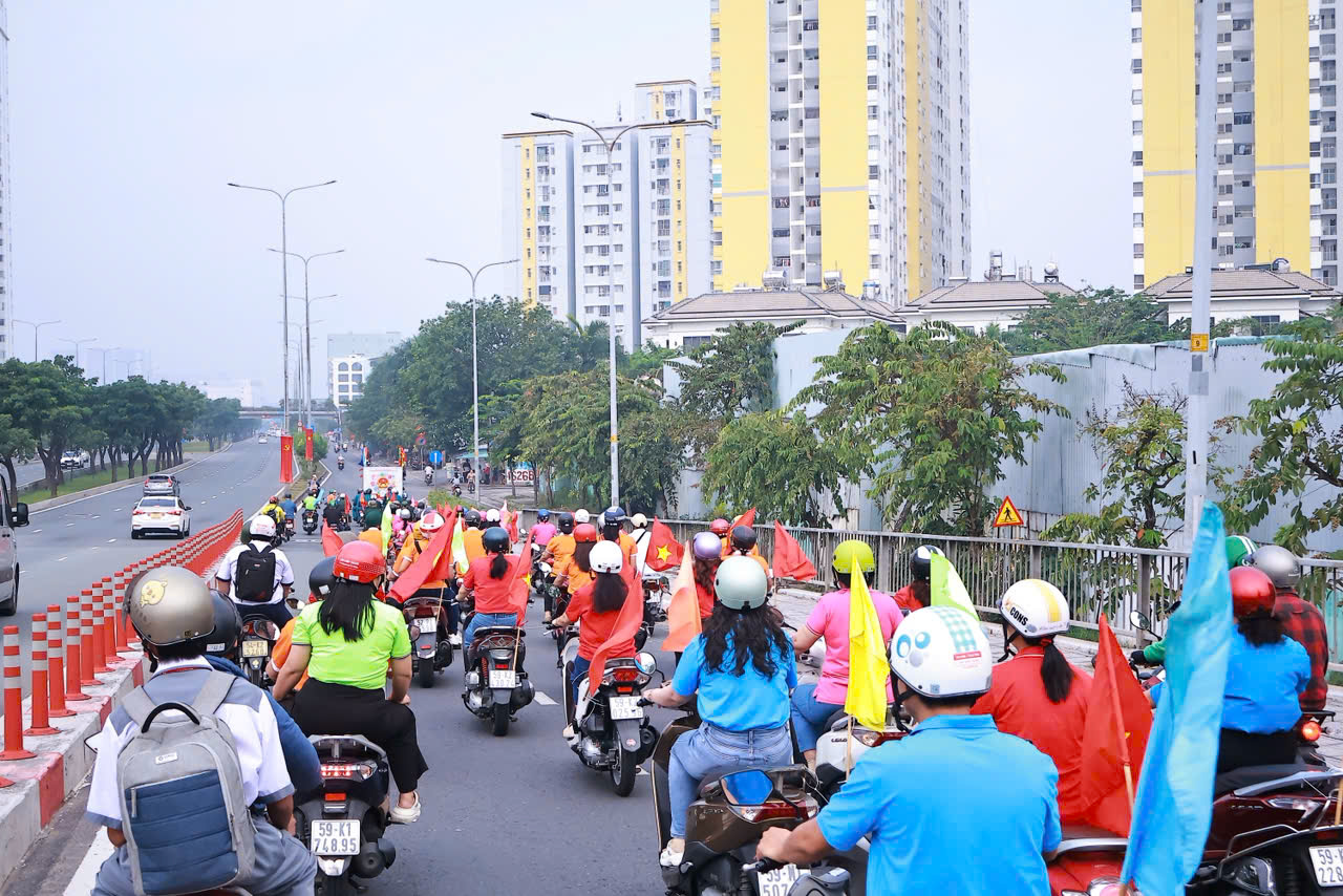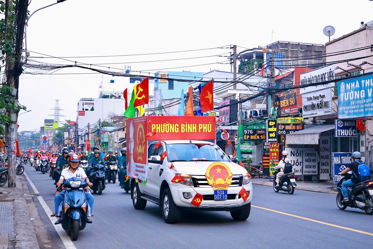Người dân phường Bình Phú diễu hành xe máy treo cờ Tổ quốc, lan tỏa không khí rộn ràng trước ngày bầu cử. Ảnh: HẢI NHI