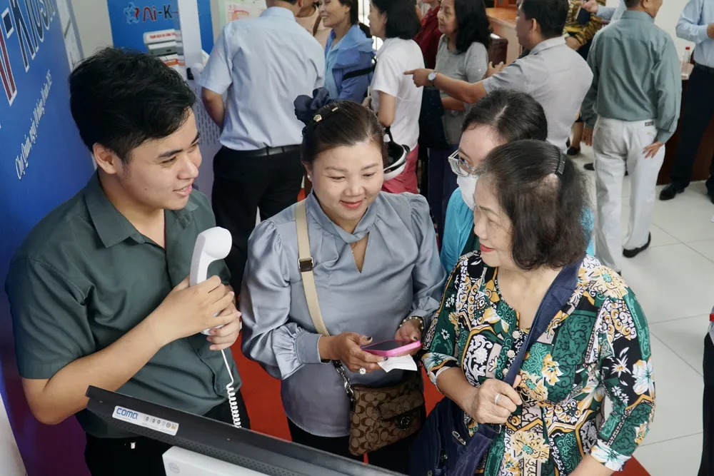 Bà Lê Thị The (thứ 2, từ trái sang) trải nghiệm AI Kiosk thông minh. Ảnh: BP
