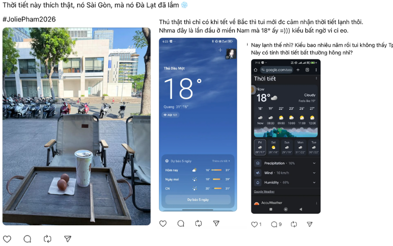 Ngay từ rạng sáng, bản tin Facebook đã ngập tràn nội dung thời tiết. Những dòng trạng thái vừa bất ngờ vừa thích thú xuất hiện dày đặc: “Mở mắt ra ngập tràn bảng tin là cập nhật tình hình thời tiết Sài Gòn”; “Cuối cùng cũng được chứng kiến ngày Sài Gòn xuống đến 17ºC”; “Thời tiết này thích thật, nó Sài Gòn mà nó Đà Lạt đã lắm. Trời đã lạnh còn xanh ngắt, thời tiết đẹp tuyệt vời”.