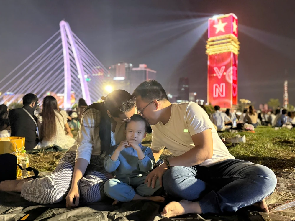 Nụ cười rạng rỡ của gia đình trẻ giữa thảm cỏ Công viên Sáng tạo khi cả thành phố cùng hòa nhịp countdown, đón chào năm mới trong không khí ấm áp và bình yên.